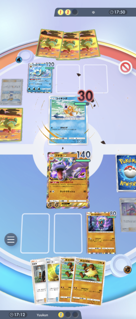 サワムラーはベンチに逃がした瀕死ポケモンやコイキングを1撃。たねポケモンかつワザ1エネなので手札からの奇襲にも使えて強い。