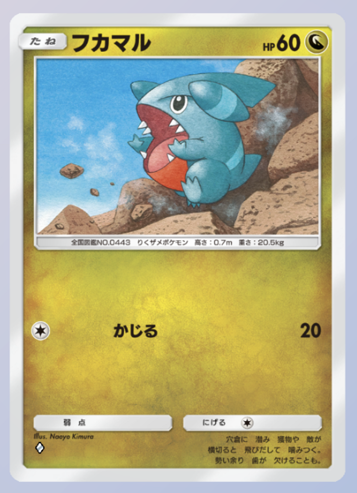 フカマル(パ)、ガバイト(パ)、ガブリアス(パ)、ニャルマー(パ)、モンスターボール(シ)、ポケモン通信(デ)、ゴツゴツメット(パ)、博士の研究(シ)、アカギ(パ)、ギンガ団のしたっぱ(デ)、シロナ(パ)