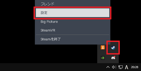 ①スチームアイコンを右クリックし、「設定」をクリック