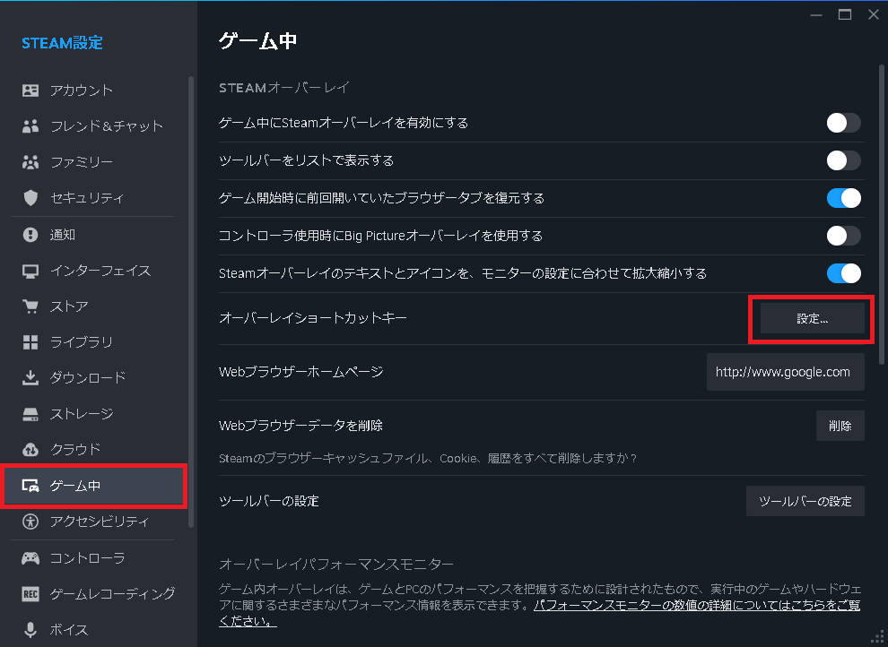 ②「ゲーム中」タブの「設定」をクリック