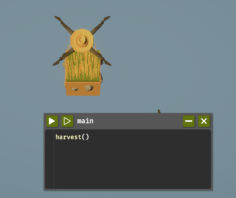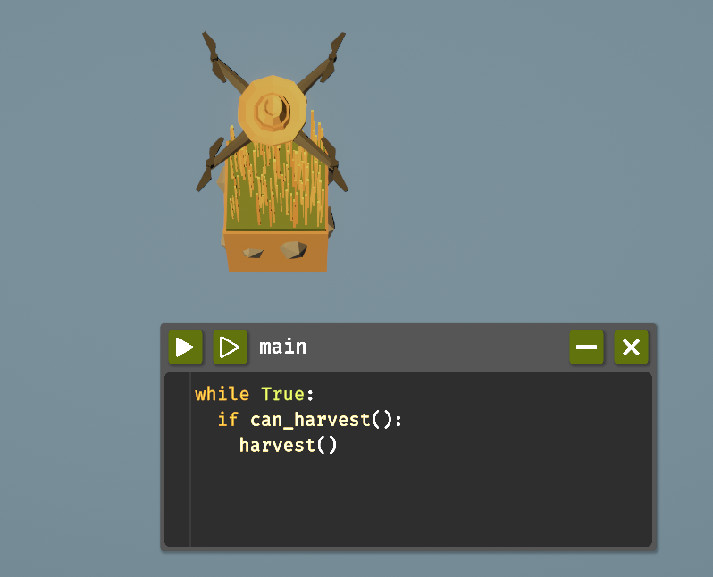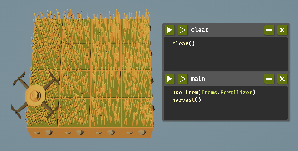 ゲームが始まると、マップには1×1マスの農場とドローンが存在し、農場の草原からは草が手に入ります。コードエディタに以下のコードを打ち込んで、タブの左上の「実行ボタン」を押して実行しましょう。実行するたびにドローンの下の草を収穫します。