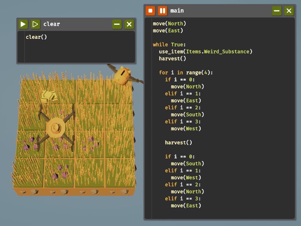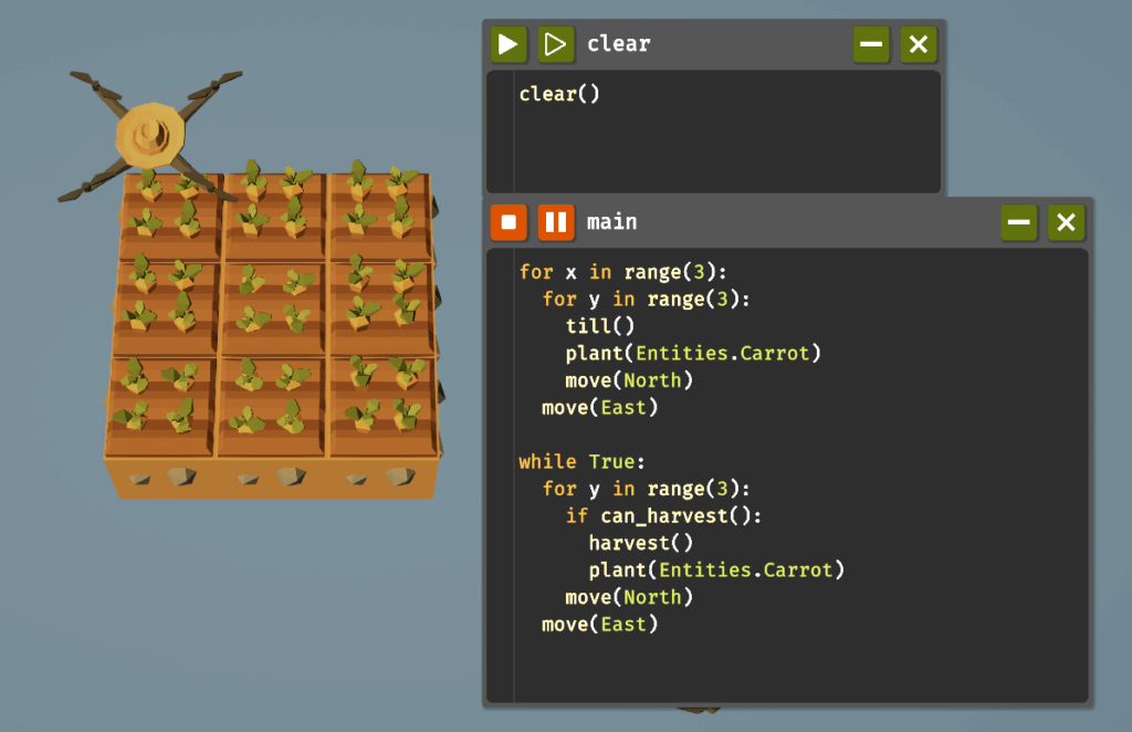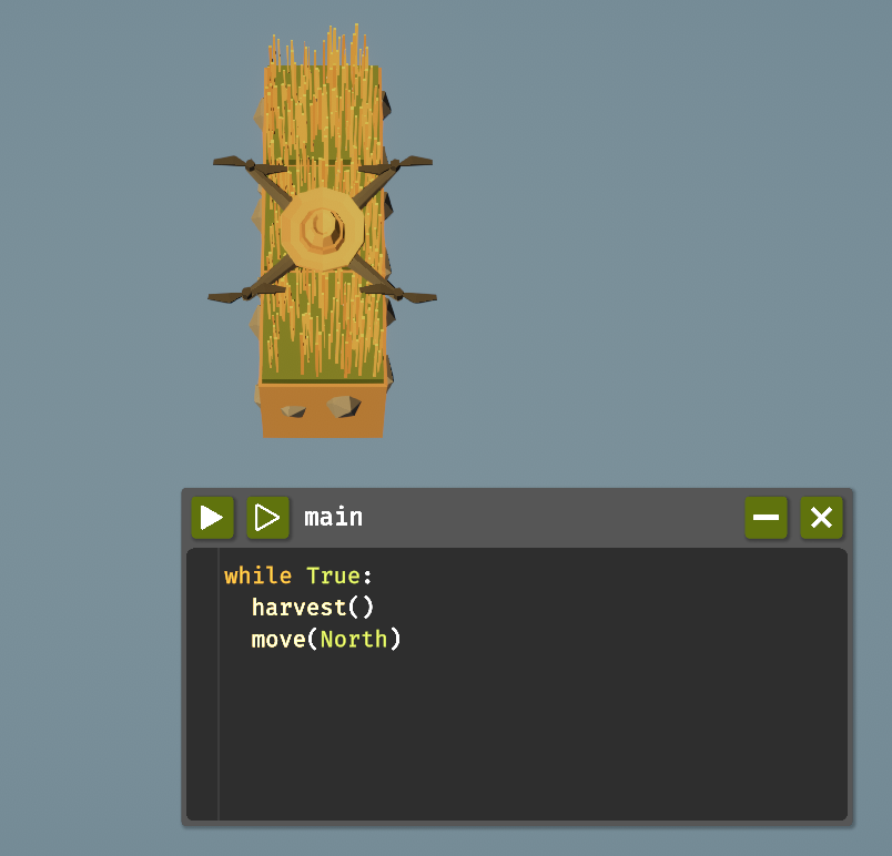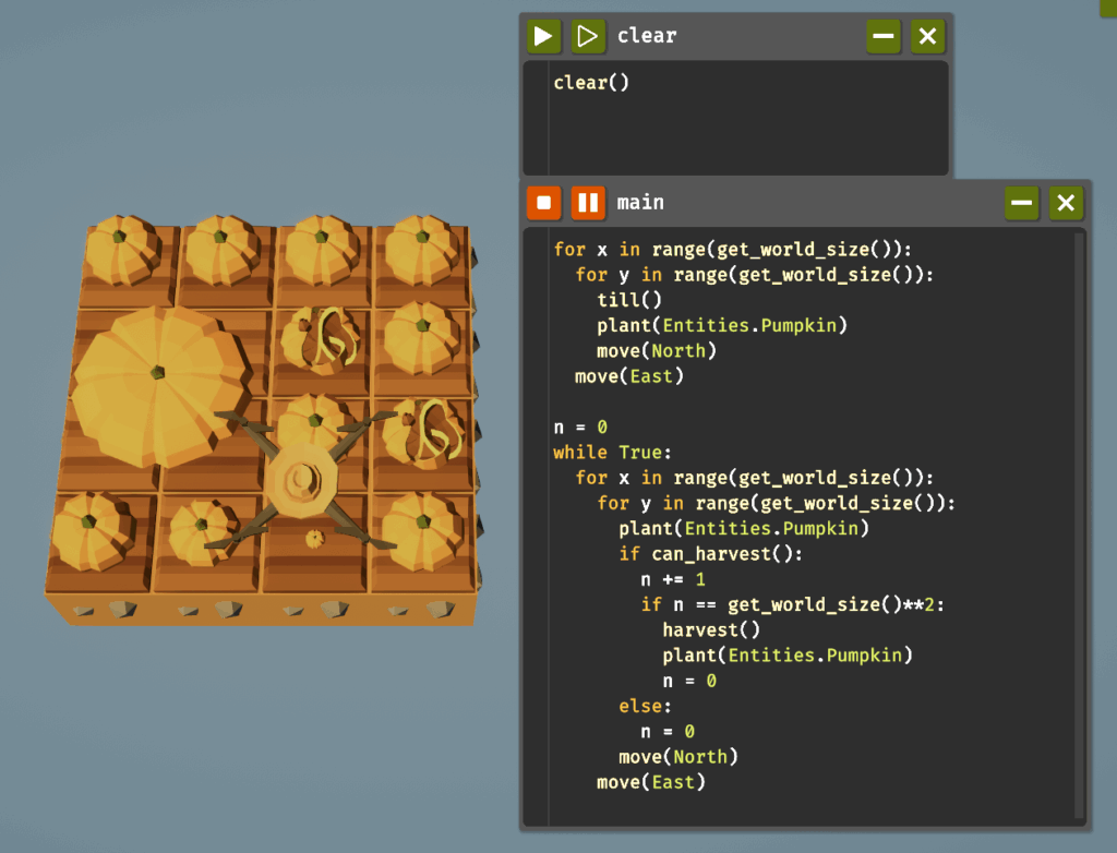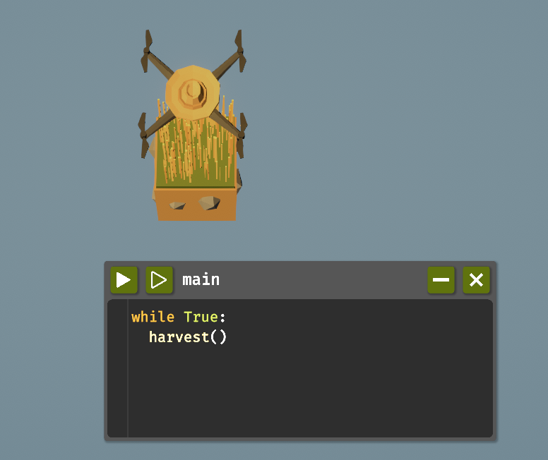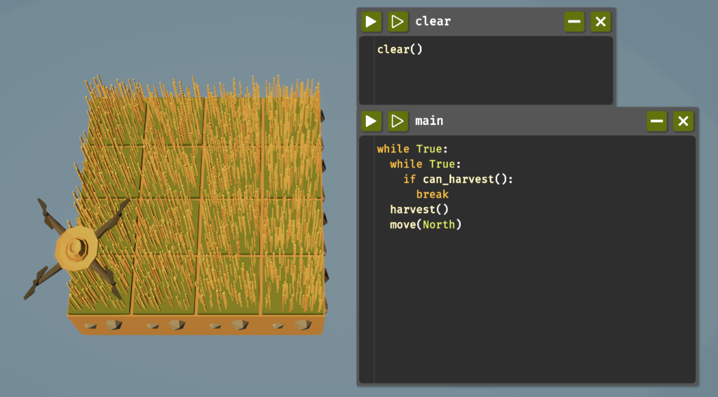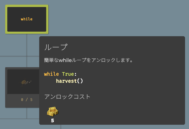 ループをアンロックしたらwhileが使えるようになります。条件がTrueの間、ブロック内のコードをループするものです。以下のコードで草を自動収穫できます。