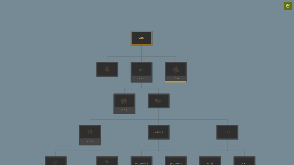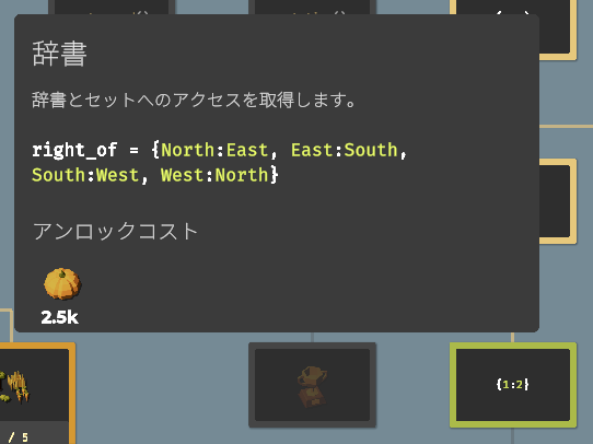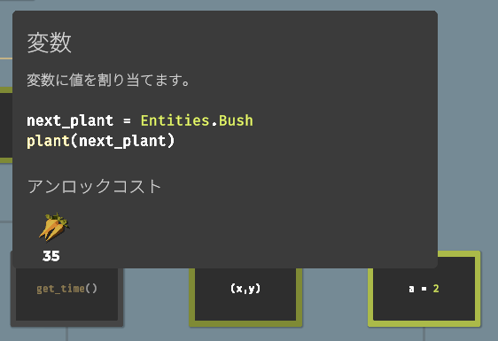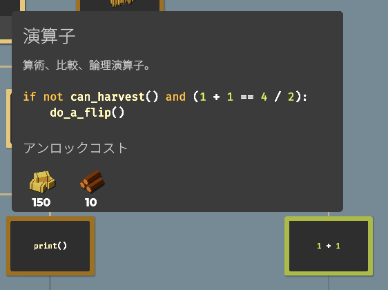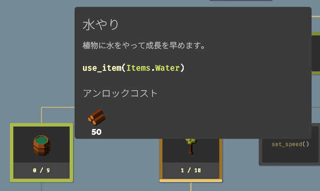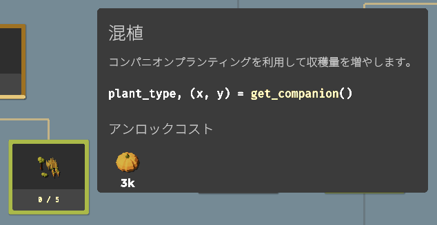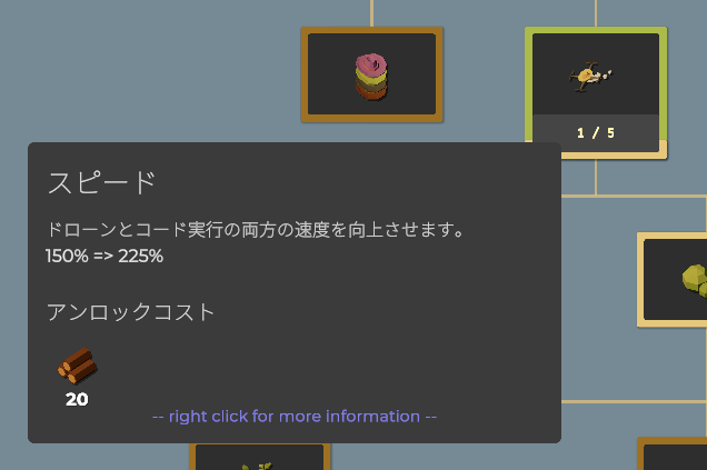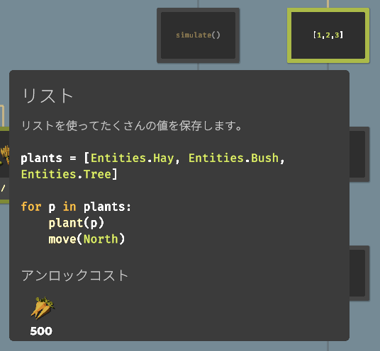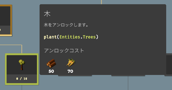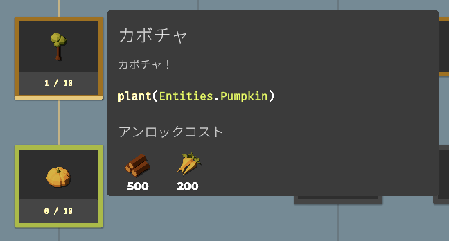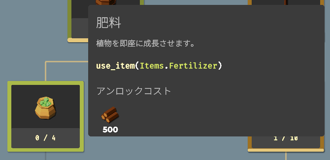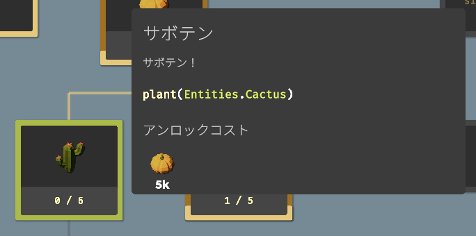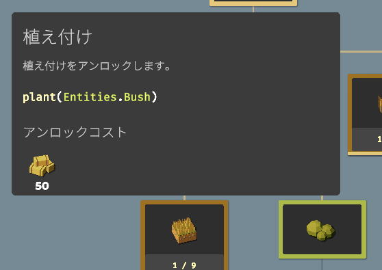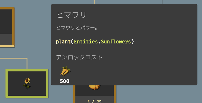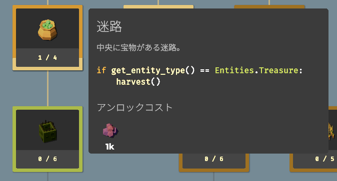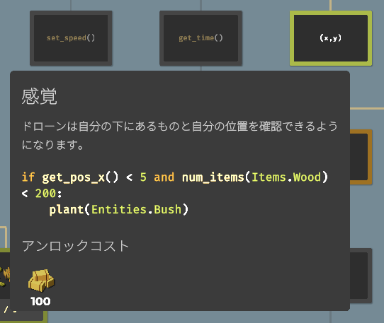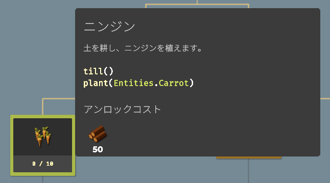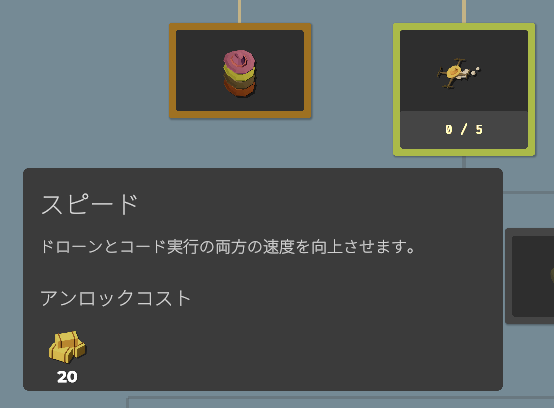 要素をアンロックすることで収穫できる作物が増えたり、使える関数(命令コード)が増えたり、農場を拡大したり、ドローンのスピードアップしたりと、農業を効率化するための要素が増えていきます。アンロックに必要な作物を収穫し、すべてのアンロックを目指しましょう。