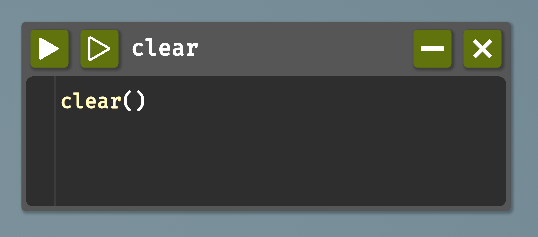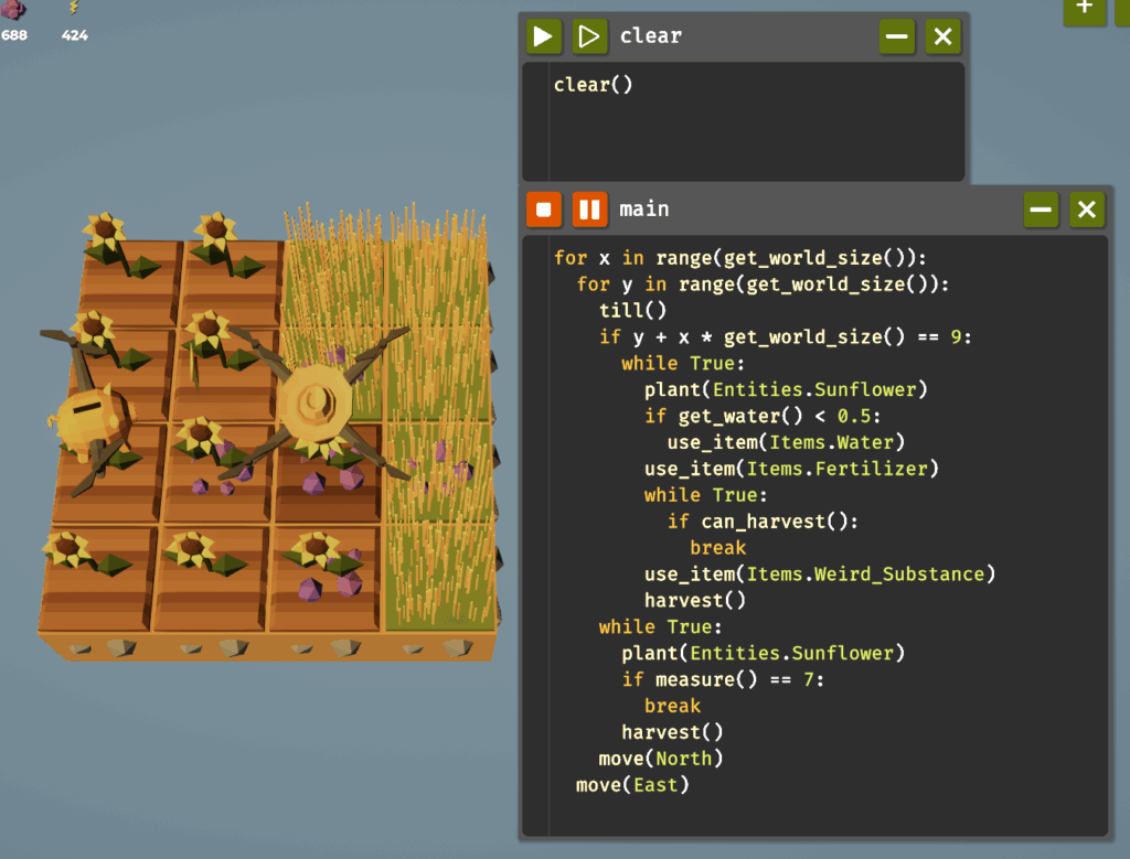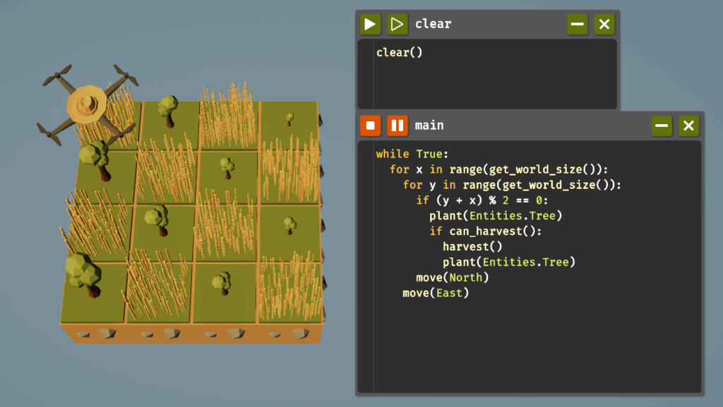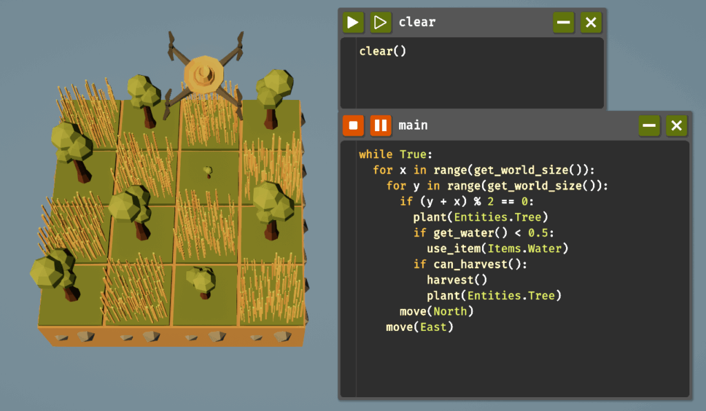 植え付けをアンロックすることでclear()関数が使えるようになります。これはドローンの位置を(0, 0)の初期位置に戻し、農場を草地に戻し、麦わら帽子に戻してくれます。簡単に言うと、状態をリセットしてくれるというわけです。毎回、コードの最初に実行するのも手ですが、専用のコードファイルを用意するのが使い勝手が良いので作ってみましょう。