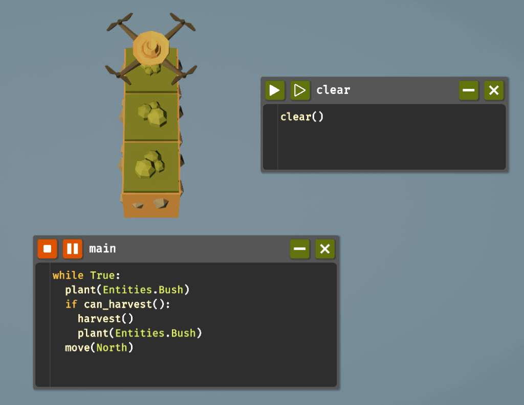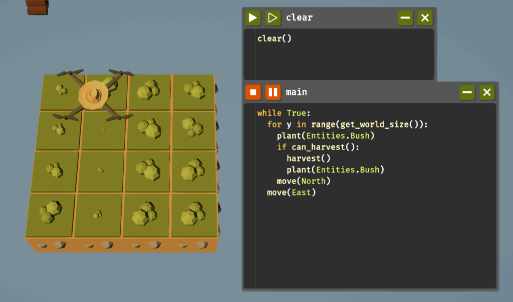 さてclearプログラムが用意できたら、新しく追加された木材を栽培していきましょう。木材を栽培するためには茂みを植える必要があります。plant()関数にEntities.Bushを渡すことで、茂みを植えることができます。while文のすぐはじめにplant()していますが、これは草を茂みに置き換えるためのものです。あとは、harvest()で収穫した後にすぐ植え直し、北へ移動します。すでに茂みが植えられているマスでplant()しても無視されるため、最初のplant()は草を茂みに置き換えるためだけのもので、次回以降はharvest()のあとのplant()により新しい茂みが植えられます。