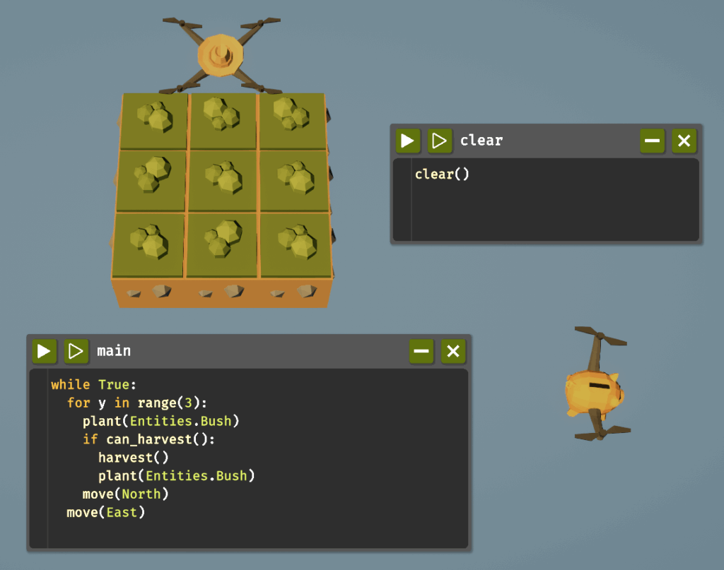 これまでは植物の成長がドローンの周回に追い付かずに収穫が空振りしてしまうことがあったかと思います。拡張された3×3のスペースをフルに使ってそれを回避していきましょう。「植える&採取して上に移動」を3回繰り返し、右に移動という動作をwhileで無限ループすることで実現します。追加されたfor文を使うことでrange()で指定した回数だけ処理を繰り返します。