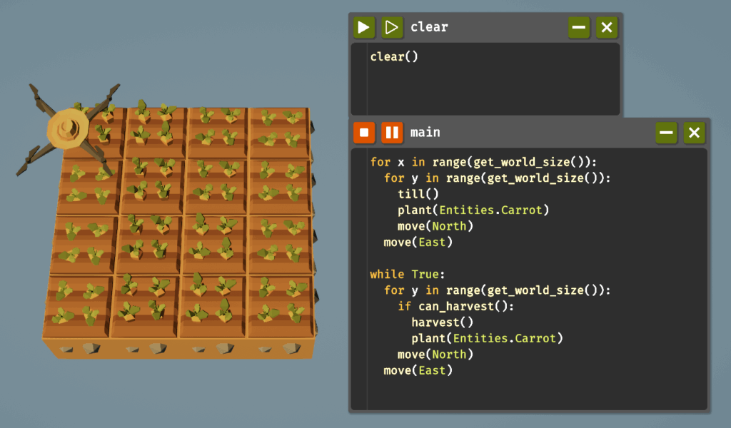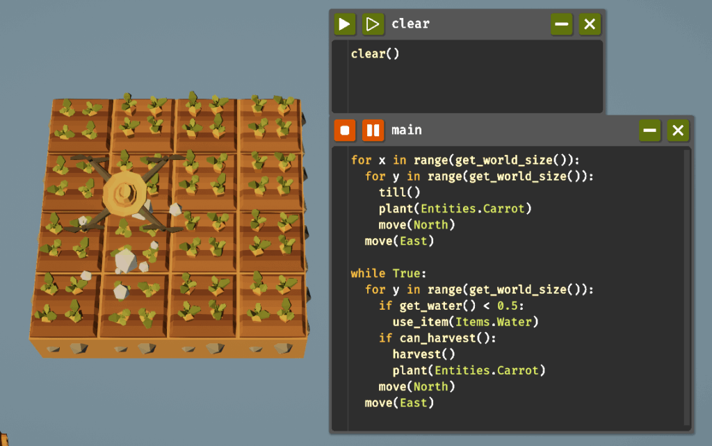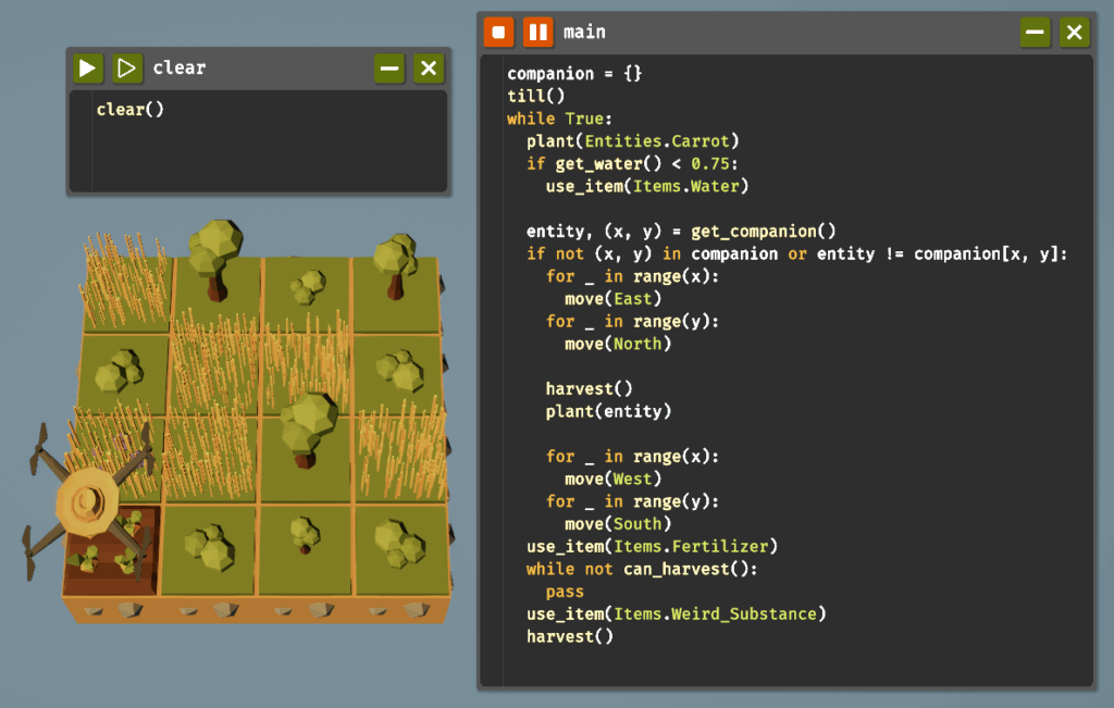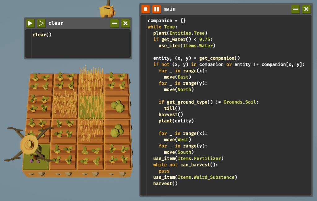 混作とは、収穫する作物に対して適切なコンパニオンプラントがあれば収穫量が増える仕組みです。収穫する植物を左下のマスに配置し、好みのコンパニオンを調べて適切な位置に植えた後、左下に戻って収穫するという動作を繰り返すことでこれを実現します。混作は草、茂み、木、ニンジンで有効なため、それぞれコードを書いていきましょう。木材の収穫に関しては木で行うのが効率的なため茂みは省略します。