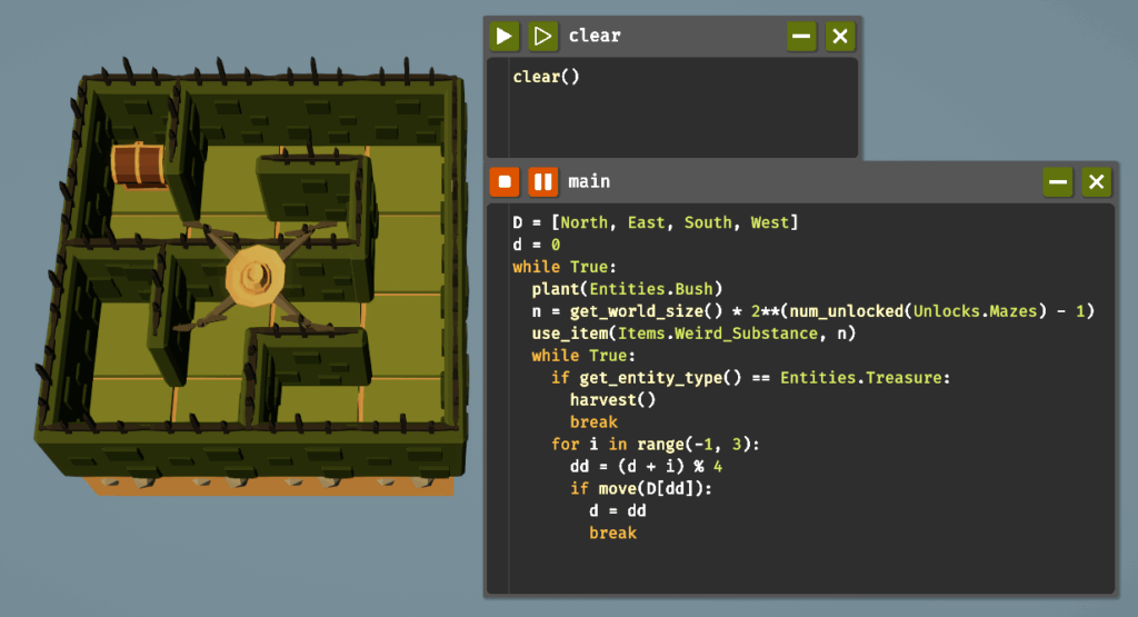 まずはmove()で移動方向を指定するための方角を、D(「方向」を意味するdirectionの略)にリストで定義します。次に、d = 0で、前回の移動方向を表すd(こちらもdirectionの略)を初期化します。dには0から3の数字が入り、Dのインデックス番号と対応しています。つまりdが0の場合はNorthを意味します。無限ループの最初で、最大サイズの迷路を作成します。こちらのコードに関してはゲーム内の迷路に関する情報で説明されています。次の無限ループは、実際に迷路を探索するためのもので、最初のif文により足元に宝箱があるかを判定し、あれば回収してループを抜け、新しい迷路を生成するという繰り返しになります。