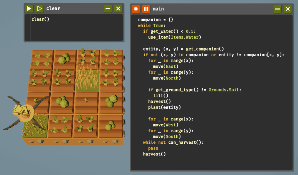 {位置: 植物, 位置: 植物 ...}の形式で存在するコンパニオンを管理するため、companion = {}で空の辞書を定義します。entity, (x, y) = get_companion()で好みのコンパニオンを取得し、entityに植物、(x, y)に位置を代入します。次の行で、取得した(x, y)のキーが辞書に存在しないか、取得した植物が辞書のものと一致しない場合、その位置に移動して適切な植物を植え直し、左下に戻ります。その後、(好みのコンパニオンが適切な位置に存在するうえで)左下の作物を収穫します。この挙動を無限ループの中で繰り返すことで混作を実現します。