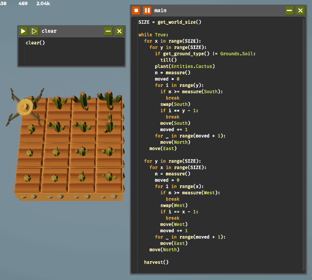 横方向でも同様の処理を行うため、コードを複製した後に進む方向を修正しましょう。縦方向の処理ですでにサボテンを植え終わっているため、植え付けに関する処理は不要になります。縦、横方向ともにソート処理が終わった後にドローンは左下に戻るので、そこで収穫することでソート済みのすべてのサボテンが一斉に収穫されてループは最初の処理から繰り返されます。また、サボテンの成長は1秒と短いため水やりは不要です。