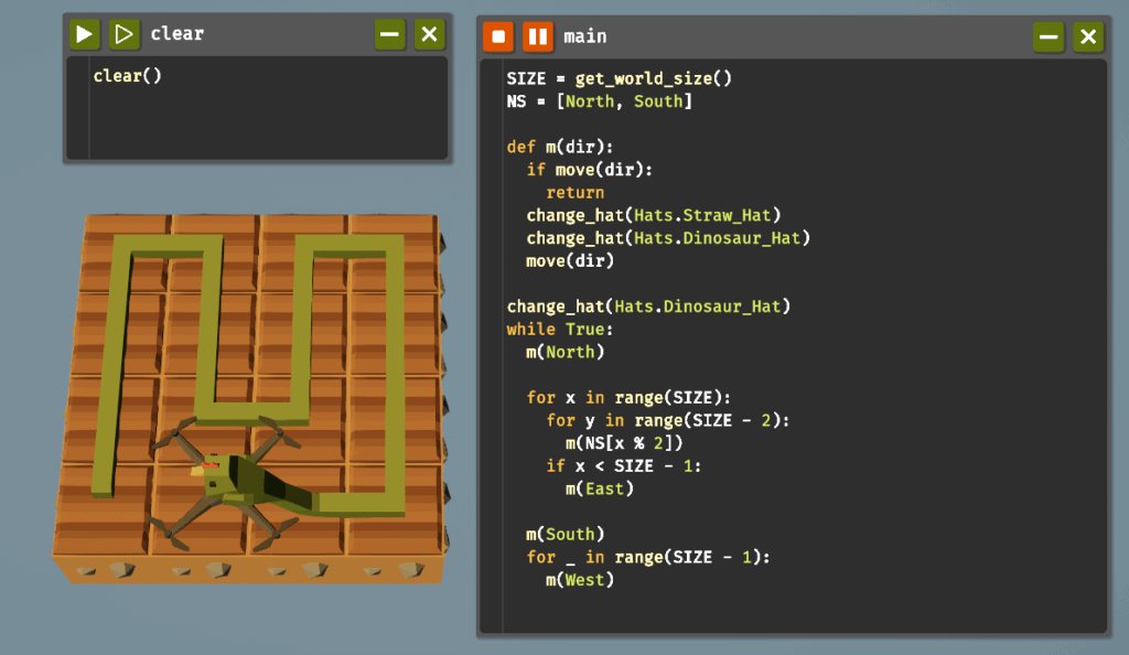 さて、新しく追加されたdef(「定義する」を意味するdefineの略)による関数定義ですが、いったん無視してその下の処理を見ていきましょう。change_hat(Hats.Dinosaur_Hat)で、恐竜の帽子を被ります。while True:で無限ループに入り、まずはm(North)で上に移動し、青いエリアの開始地点へ。この後の2重のfor文により青いエリアでの上下のくねくねした動きを実現します。m(NS[x % 2])では、x座標が偶数ならm(North)、奇数ならm(South)が実行します。ここは本来move()関数なのですが、move()するたびにクリア判定(全マス尻尾で埋まったか)をしたいので、そのために定義したm()関数を使っています。それでは定義したm()関数の中を見てみましょう。