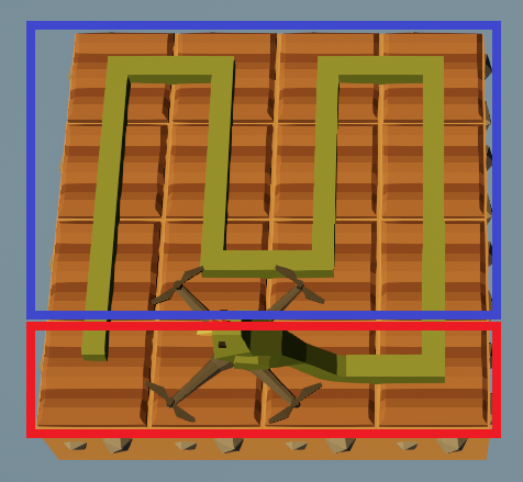 迷路はループしない作りになっていて、これは全ての壁が繋がっていることを意味します。つまり、壁にそって進み続ければすべてのマスに到達できるということです。今回のロジックでは、常に左を優先して進むことでそれを実現します。左に進める場合進み、進めない場合は前、前も無理なら右、それも無理なら後ろ、という形で進路を選択し、最後の移動を変数に記憶することで、現在ドローンの向いている方向を表すため、それをもとに次の進路を選択します。