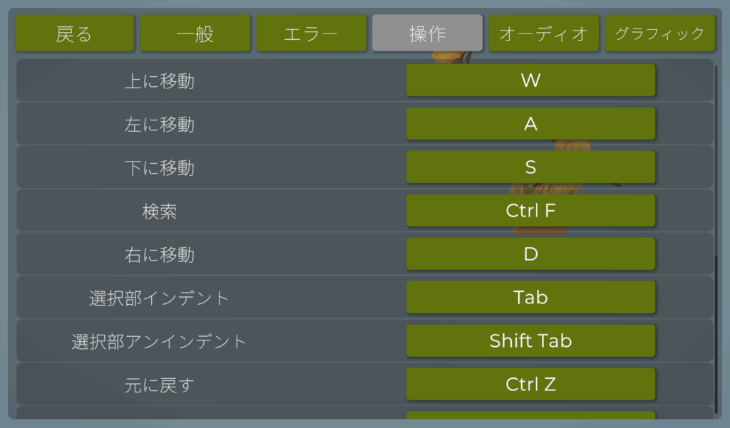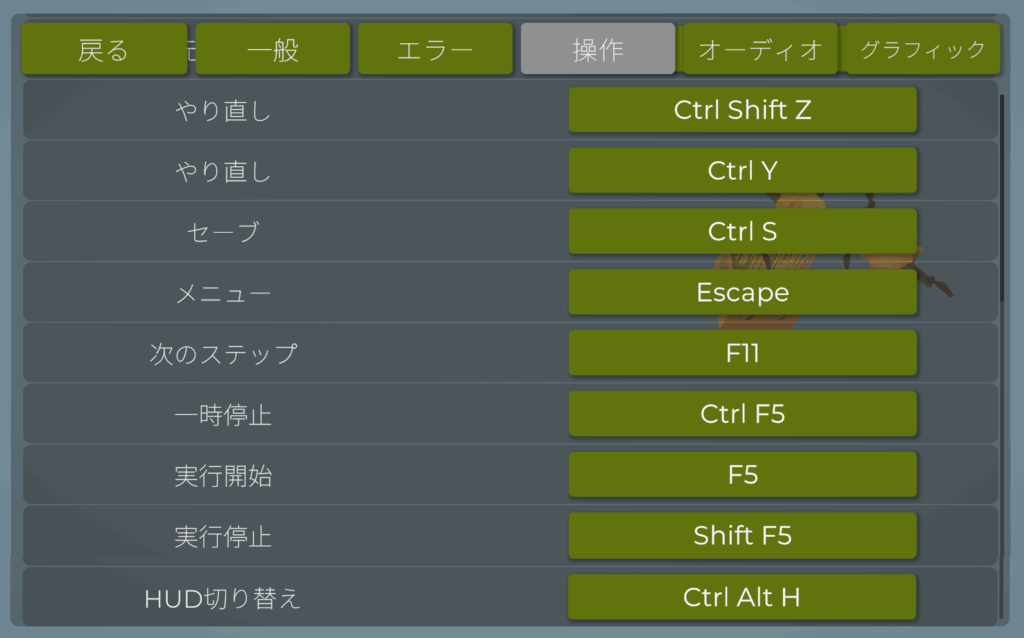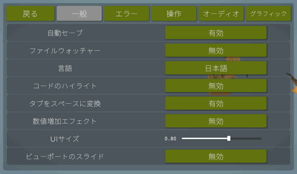 長時間のプレイを快適にするために設定を結構変更しているので一応共有します。無駄なエフェクトなどを一切省いた、コーディングに集中するための設定のためデフォルトである程度遊んだ後に試すのが良いかと思います。また、スペックの低いPCでプレイしているため、動作が軽くなるように設定しています。