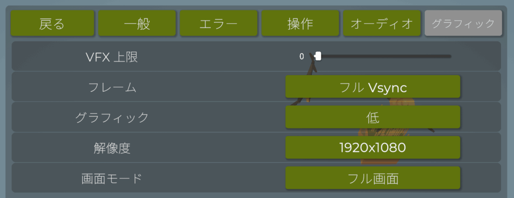 エンドコンテンツではタイムアタックでリーダーボードに挑戦できるので、プログラムを高速処理させるためPCに負荷がかかってきます。そういう場合はこちらでグラフィックの品質を下げると負荷が減らせるかと思います。