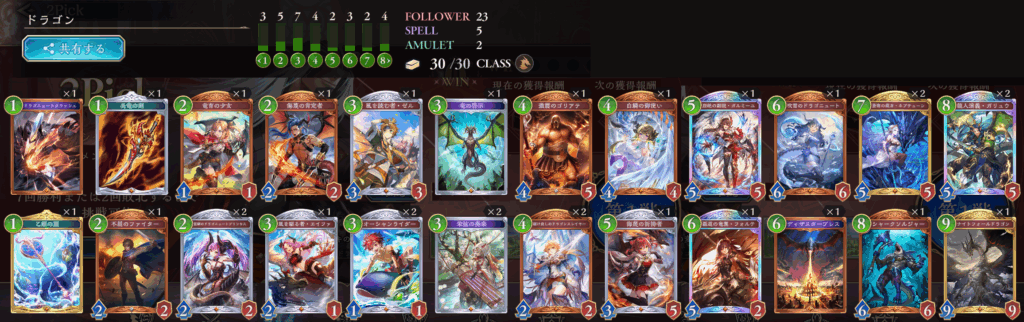 キーカードは、ナイトフォールドラゴン1、ガルミーユ1、フォルテ1、ザハール1、乙姫の扇1。全体的にバランス良く組めているかと思います。弱いカードが無いのも良いですね。Bランクのカードも1枚までなら強く使えそうなので悪くないです。ドラゴニックストライクも2枚だけど強く使えました。やはり2PickでAoEは強いです。