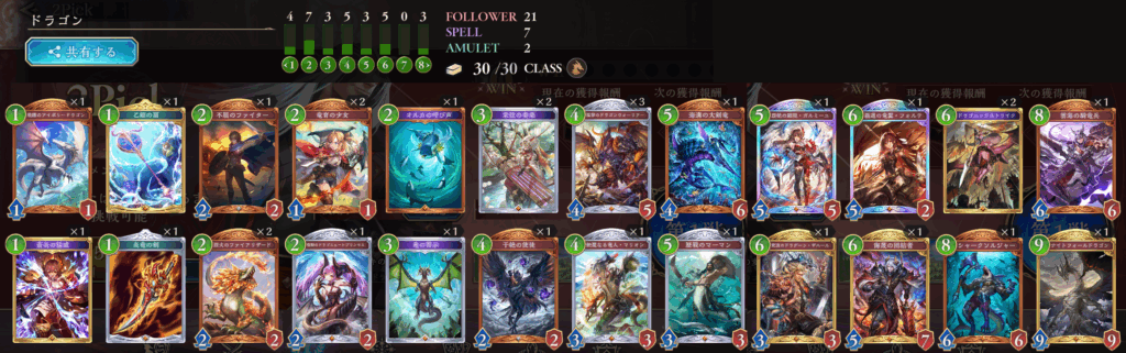 ガリュウ2、ネプチューン2、ナイトフォールドラゴン1、ガルミーユ1、フォルテ1とバリューの高いカードが多く取れていて、バランスも良いです。見るからに7勝デッキという感じです。