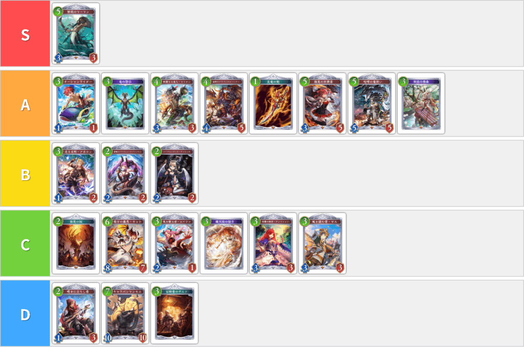 - マーマンが強すぎるためSランク独占。進化権の使いどころの最有力候補の1枚。何枚でも欲しい。