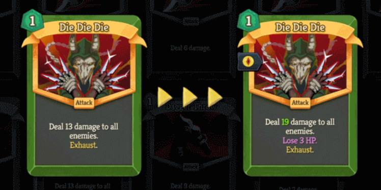 画像のように、アタックカードが与えるダメージが増える代わりに、自傷ダメージ効果も付くといったものが予定されているようです。レアイベントやその他非公開の方法で付与されるものらしく、その他のエンチャント効果はまだ公開されていませんが、とてもレアな場面ではデメリット効果のないエンチャントも付与できる可能性があります。