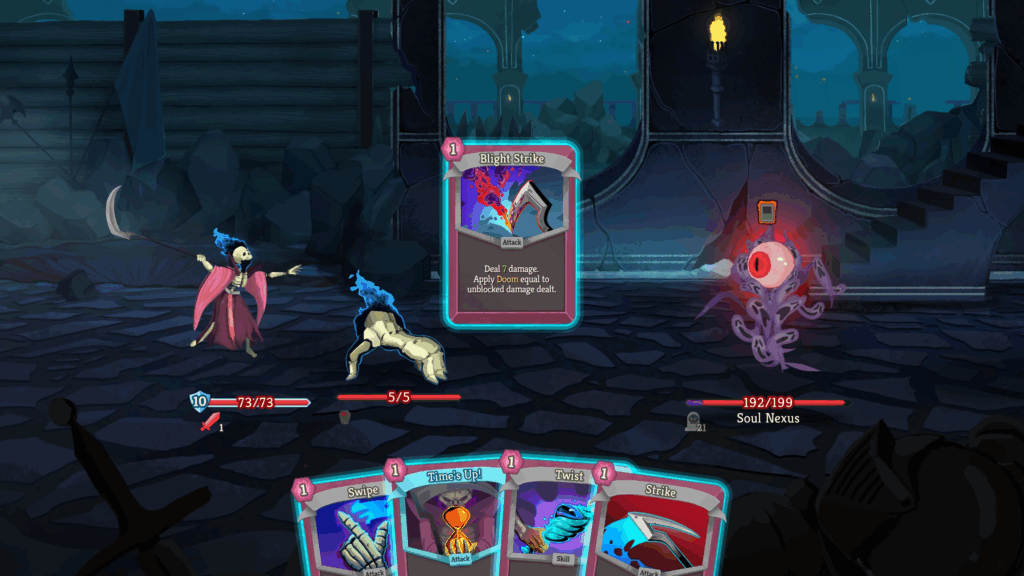 カードテキストを見ると、Doom(破滅)は相手に付与する効果になっています。ゲームプレイPVでは、実際にDoomが付与されている様子も確認でき、アイコンは墓石の形をしています。前作でも登場した弱体や脆弱などのデバフ効果にあたると思われます。