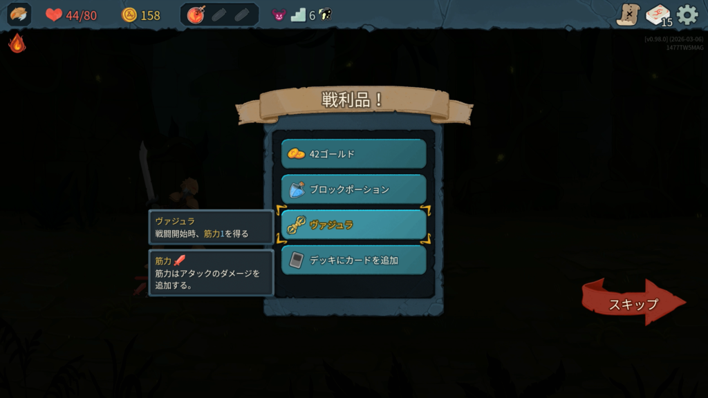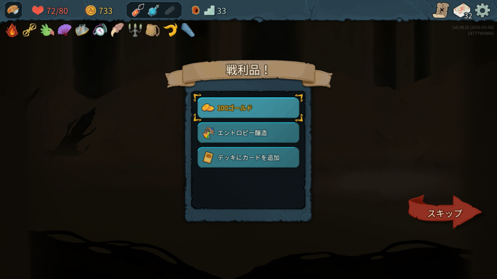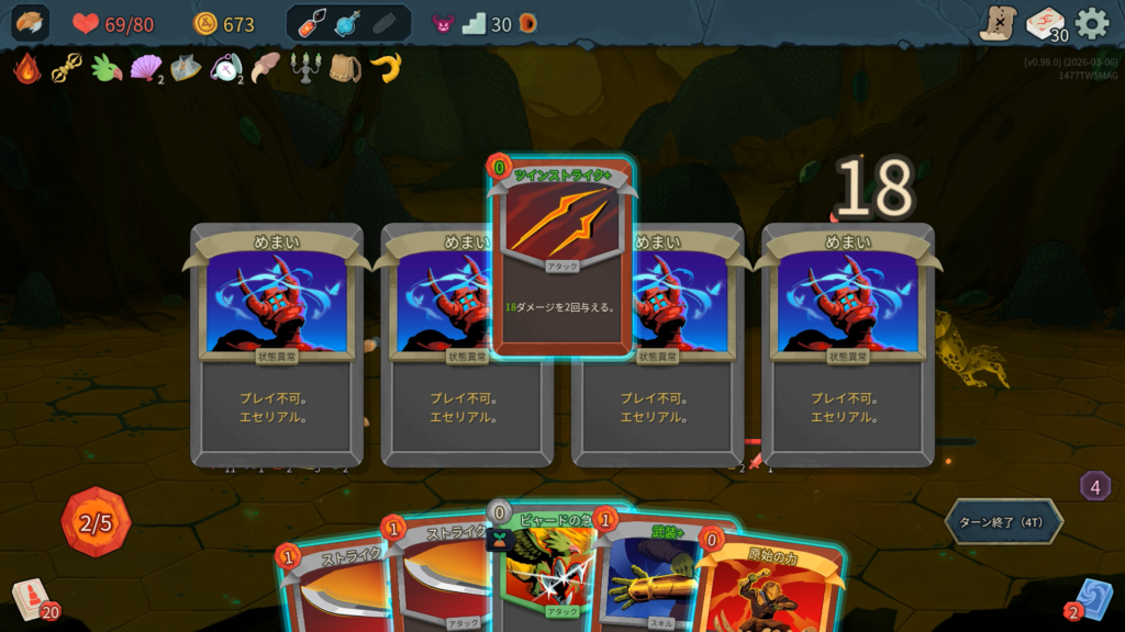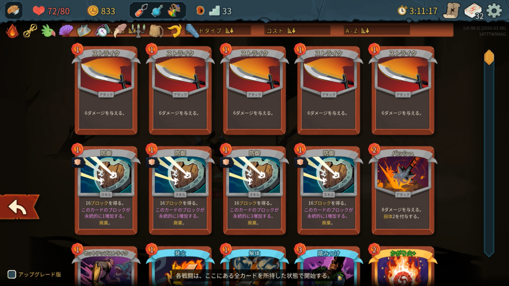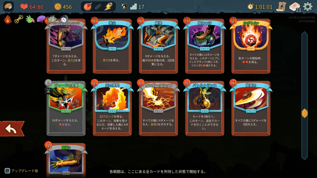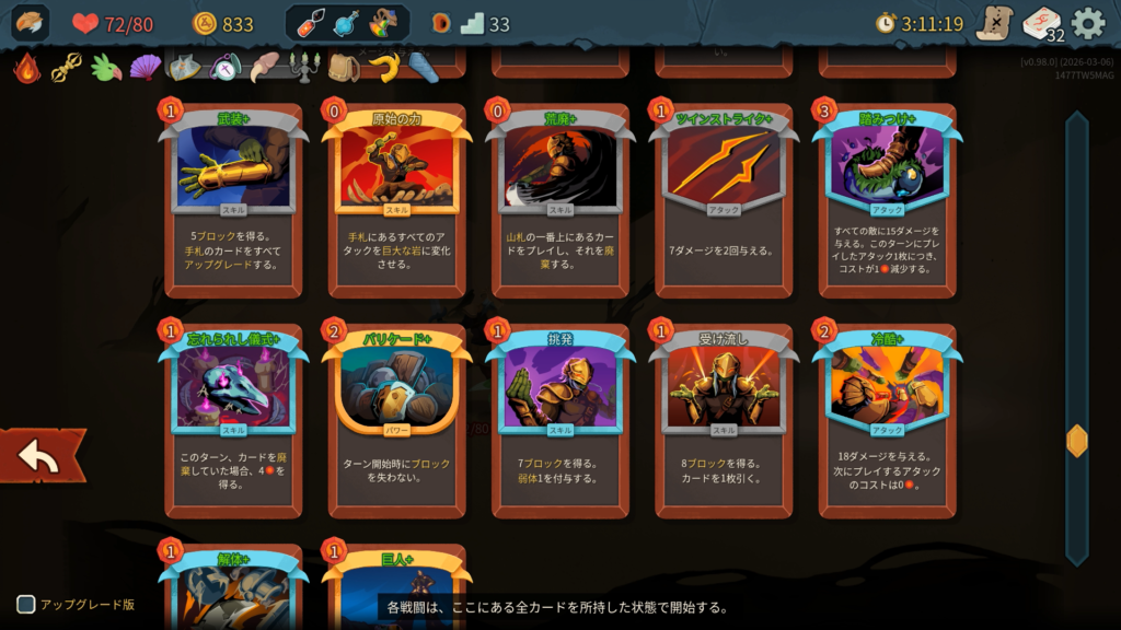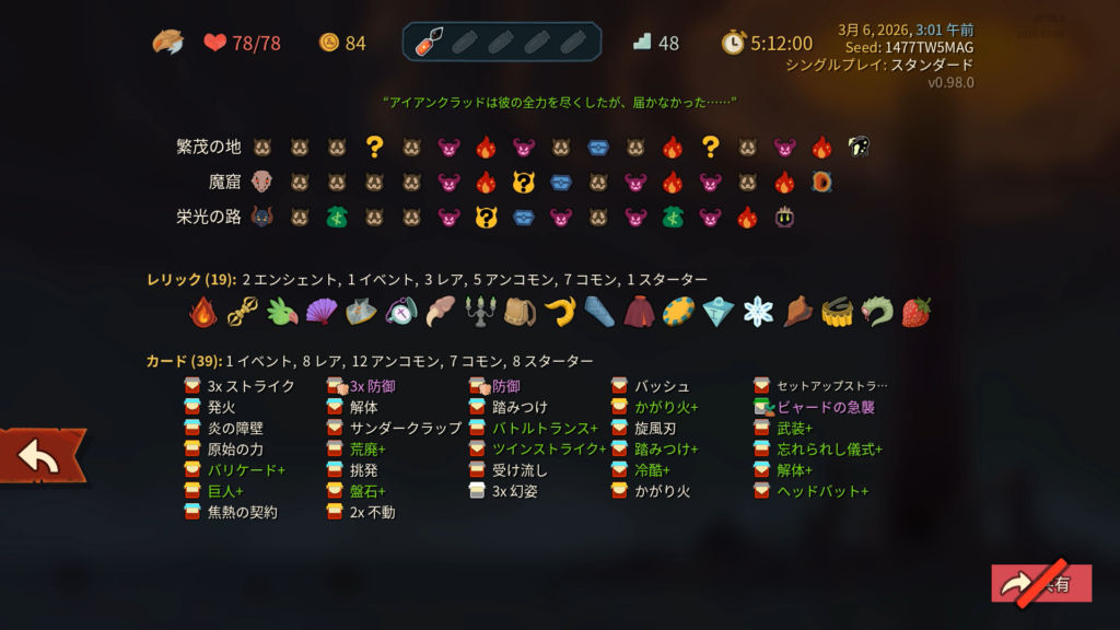 ストライクと防御は削除する余裕がありませんでした。ショップには一度もよらずにエリート討伐のルートを優先しました。カード報酬はスキップせずに全部取得しました。ボス戦では「かがり火+」、「武装+」、「バトルトランス」が強かったです。特に今作ではボス討伐後にボスレリックがもらえないため、強力なエナレリ(エナジー供給レリック)が入手できないため、かがり火のようにカードからのエナジー供給を確保することが重要だと思いました。