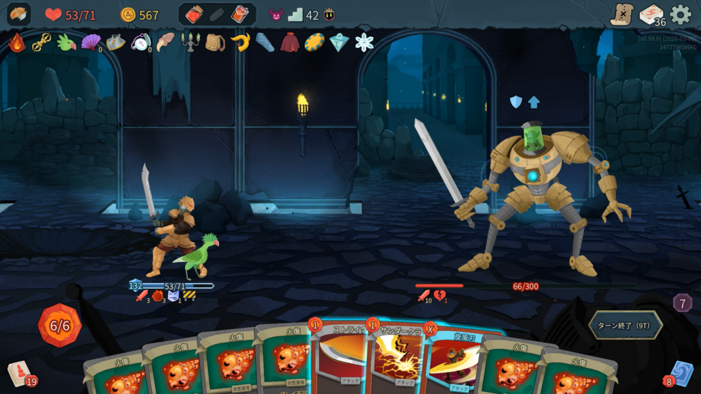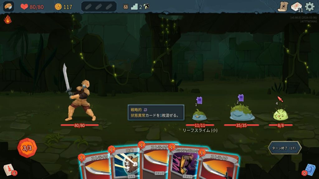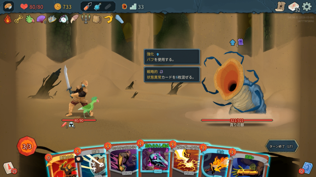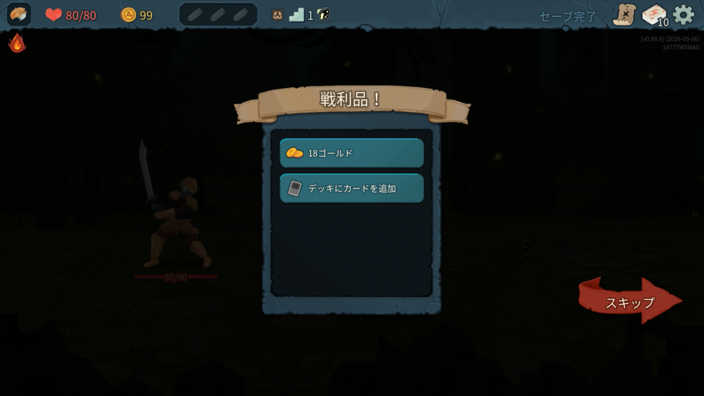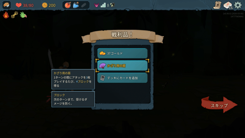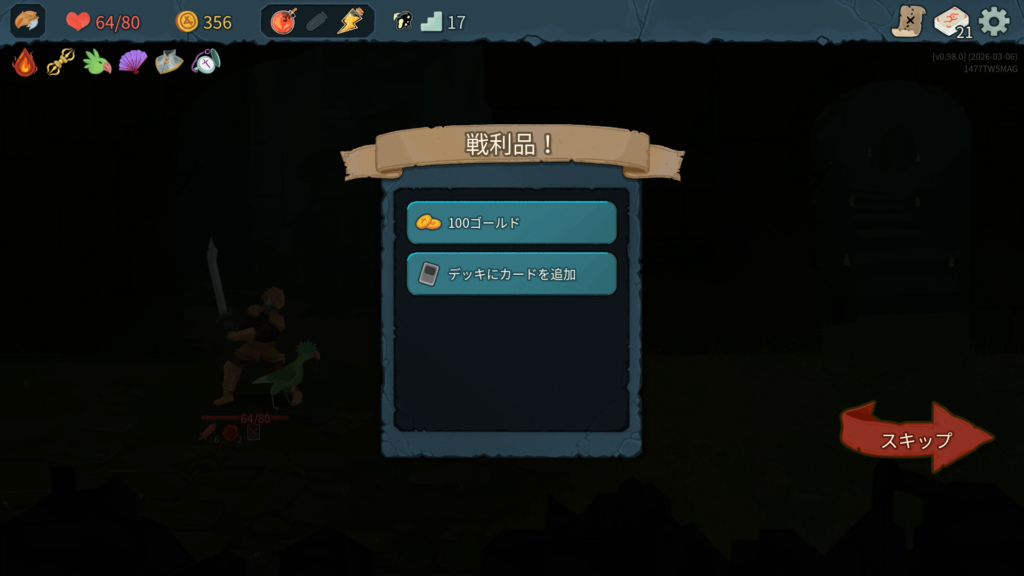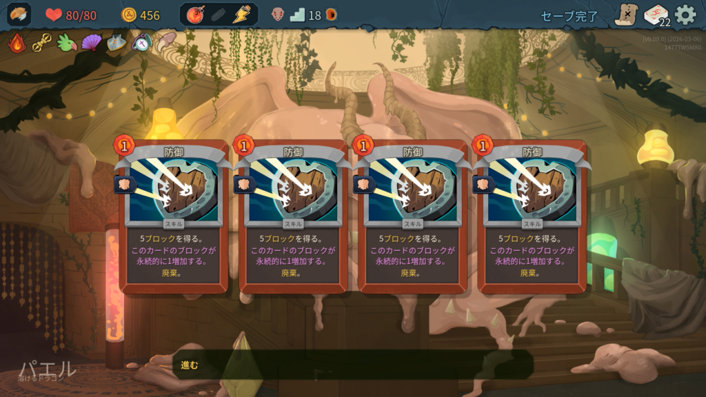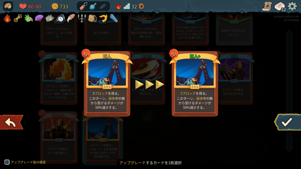 2層で獲得した「巨人」は、弱体中の敵からのダメージを半減させてくれる優秀なブロックカードで強かったです。今作のアイクラは弱体を付与するカードが多くある印象で、攻略の鍵になりそうです。