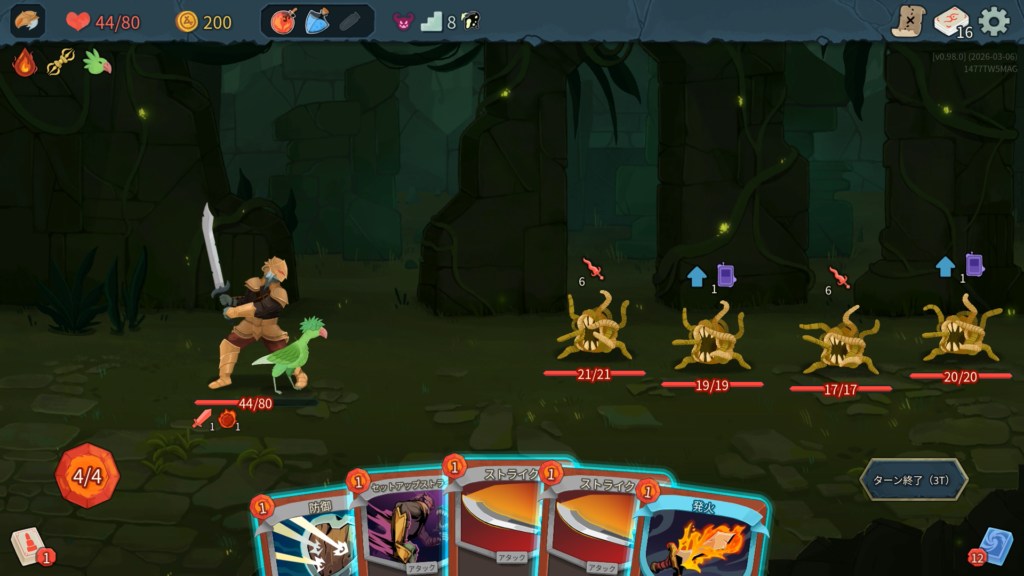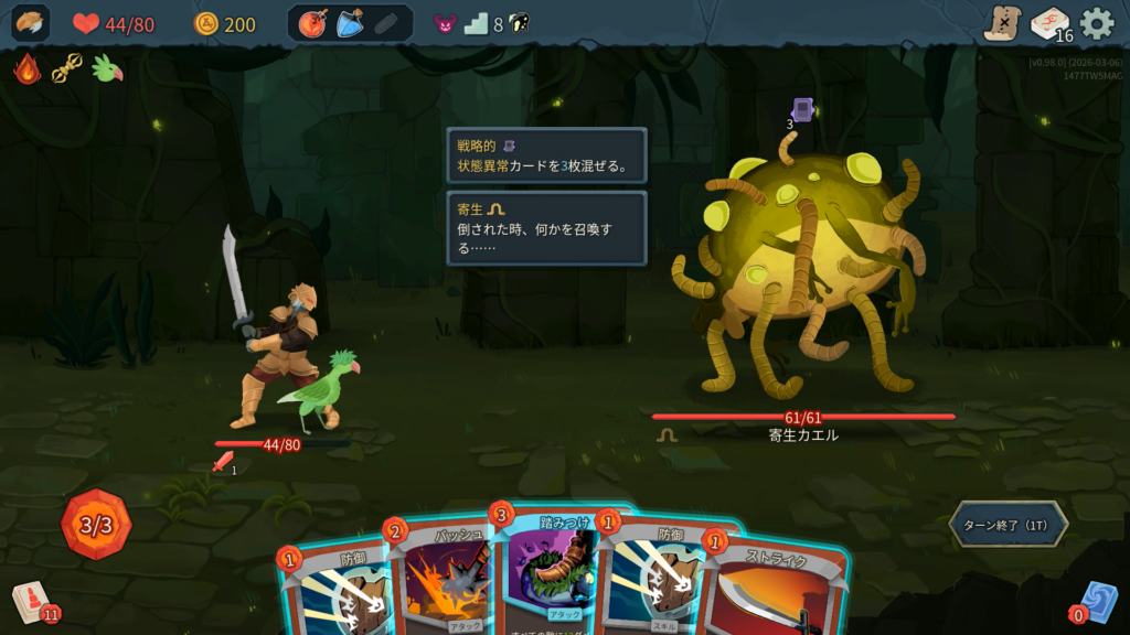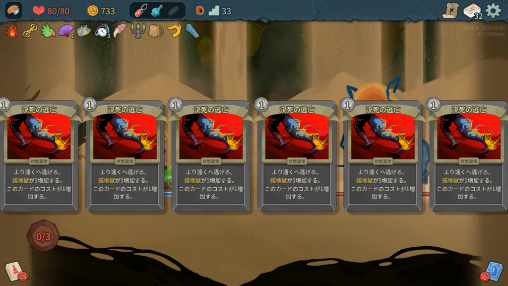 1ターン後、「決死の逃亡」という状態異常をデッキに3枚、捨て札に3枚の計6枚混ぜてきます。