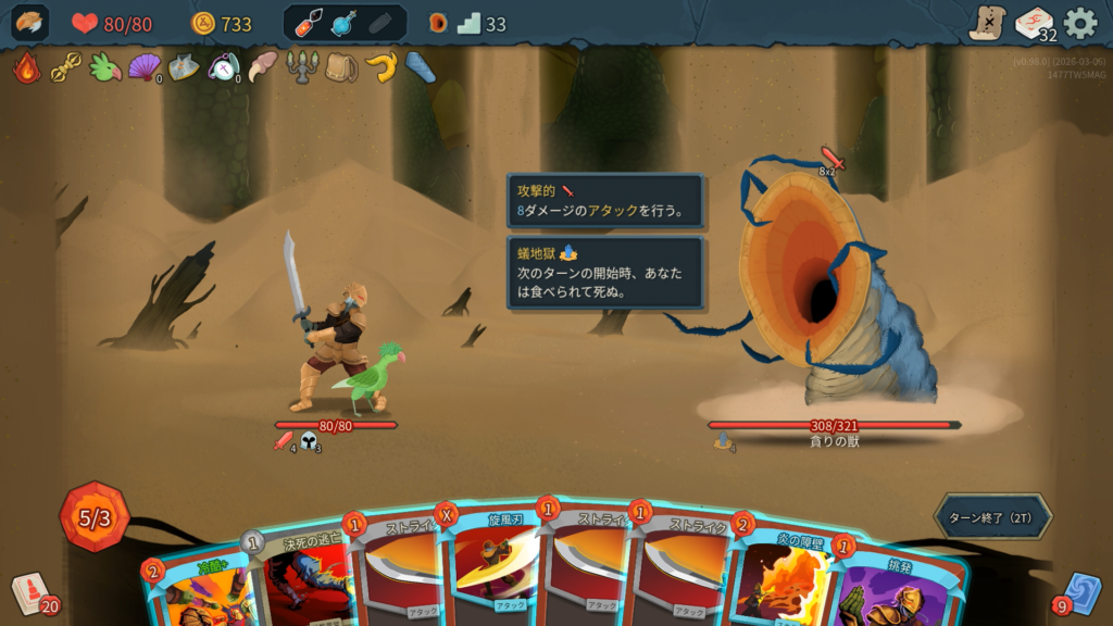そして敵に「蟻地獄」という能力が追加され、「次のターンの開始時、あなたは食べられて死ぬ。」という恐ろしい文面が。蟻地獄4で開始し、ターンが終わる度数値が1減り、0になると食べられて即死という能力。数値の減少とともに徐々に吸い寄せられていく演出は、死と隣り合わせの緊張感を味わうことができます。先ほどデッキに混ぜられた「決死の逃亡」を使用することで蟻地獄の数値を1増加させ、時間を稼ぐことができます。