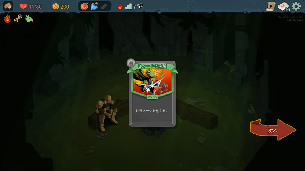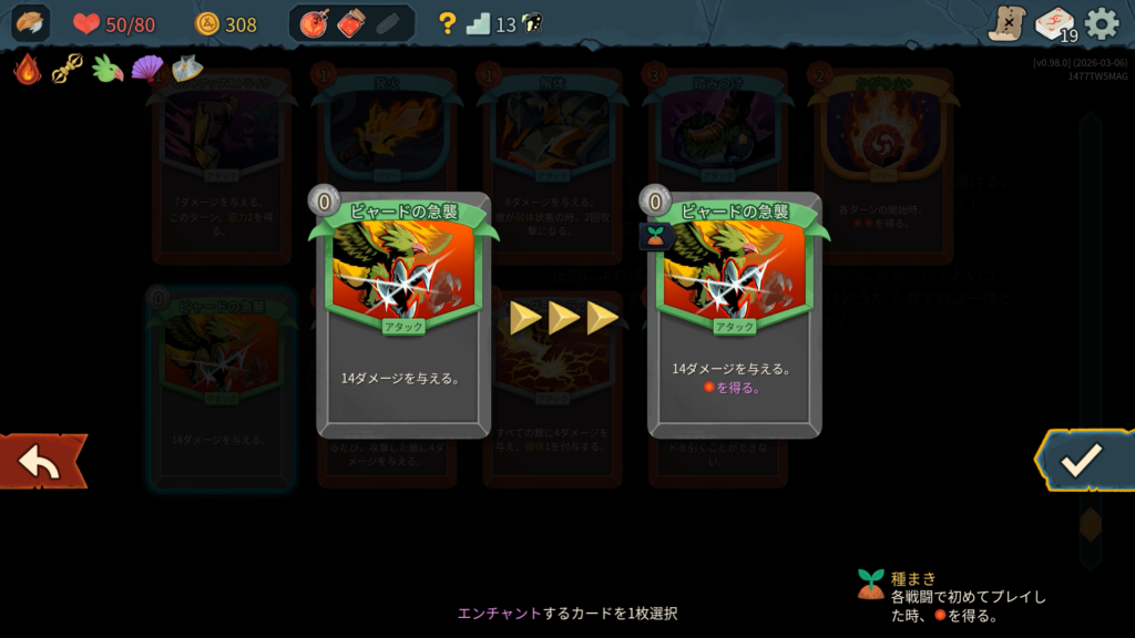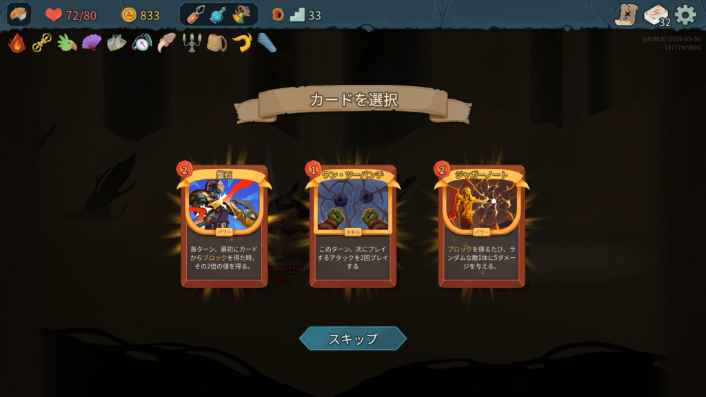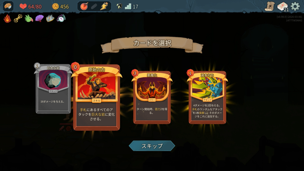 新カードの「滅多打ち」は面白い効果ですね。ダメージの高いアタックがデッキにないため今回は「原始の力」をピックします。こちらも面白そうな新カードです。アップグレードで「巨大な岩+」になり、20ダメージとなります。