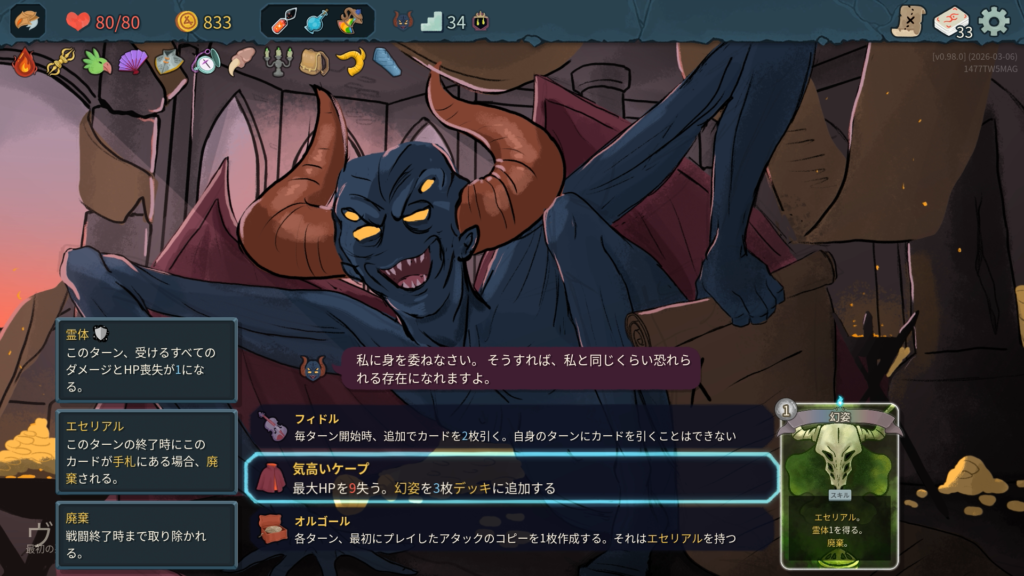 「フィドル」は、デッキにドローソースも含まれているため、「自身のターンにカードを引くことはできない」のデメリットが大きいため今回は無しですね。「オルゴール」は、シナジーの強いアタックが特にないため無し。「気高いケープ」はターン中の被ダメを1に軽減する「幻姿」をデッキに3枚追加と非常に強力なうえ、デメリットが「最大HPを9失う。」と軽すぎるのでこれを選択。