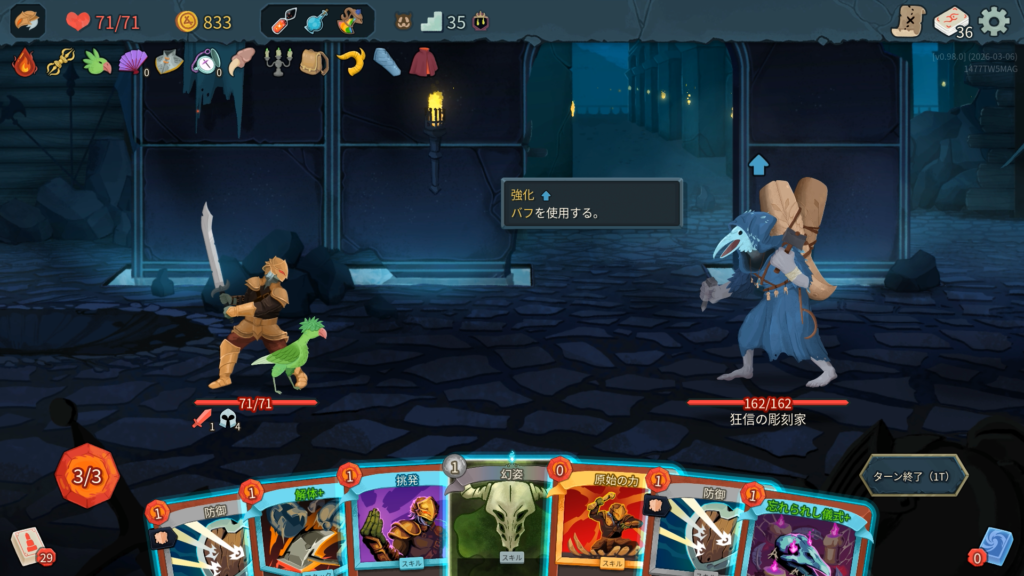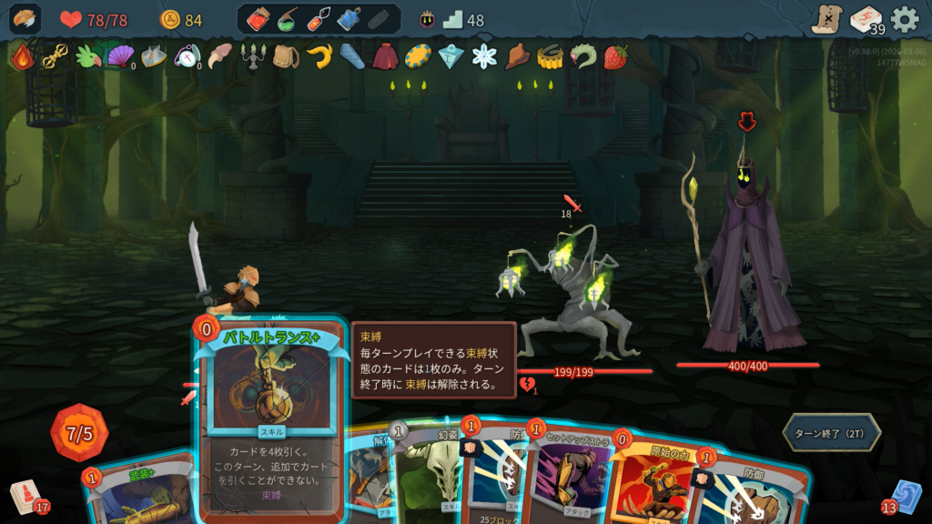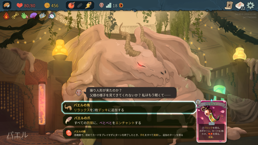 今作から登場する強力なエンシェントレリックを3択から選び獲得します。どれも個性的なもので、今後の使用感が大きく変化する重要な局面。新カード「リラックス」のフルアートデザインも今時でかっこいいですね。能力と比較して3コスは重いなと思い、他の2択で悩んだ末、弱い「防御」を育てて有用なものにしていくことのできる「パエルの爪」を選択。
