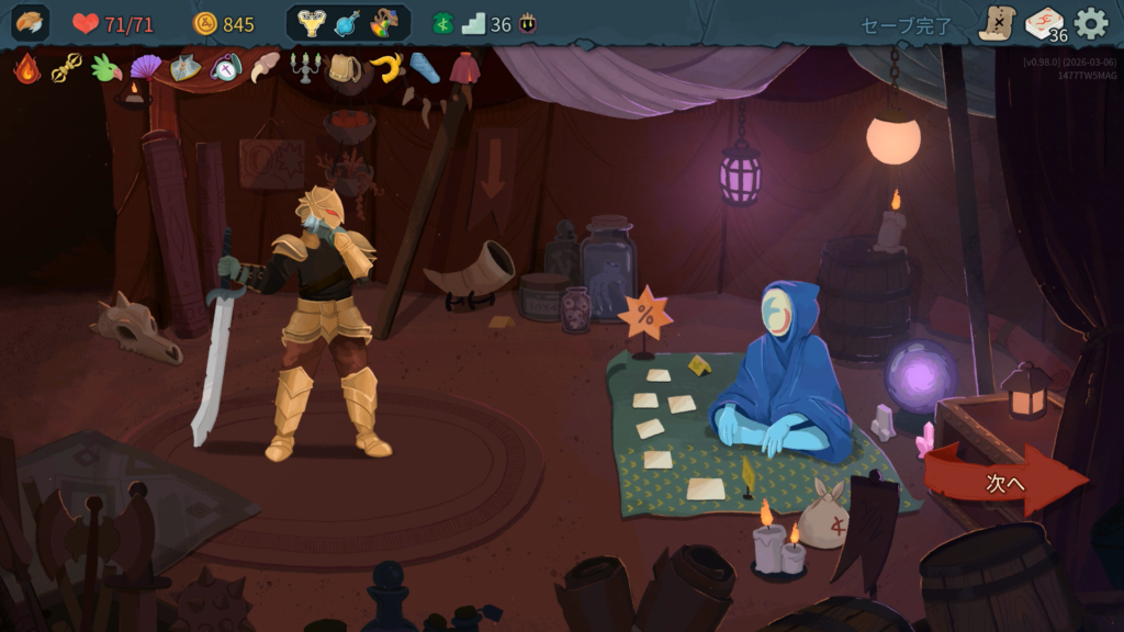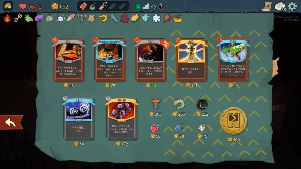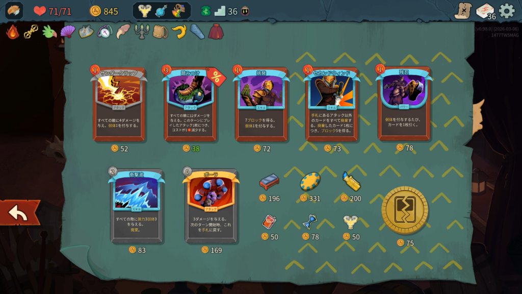 品揃えはこんな感じで、前作と同じ感じですね。そういえばポーションの見た目がより視覚的になって分かりやすくなりましたね。ギャンブルチップを買い、ストライクを1枚削除して、残りは予定しているルートにある次のショップのために温存します。