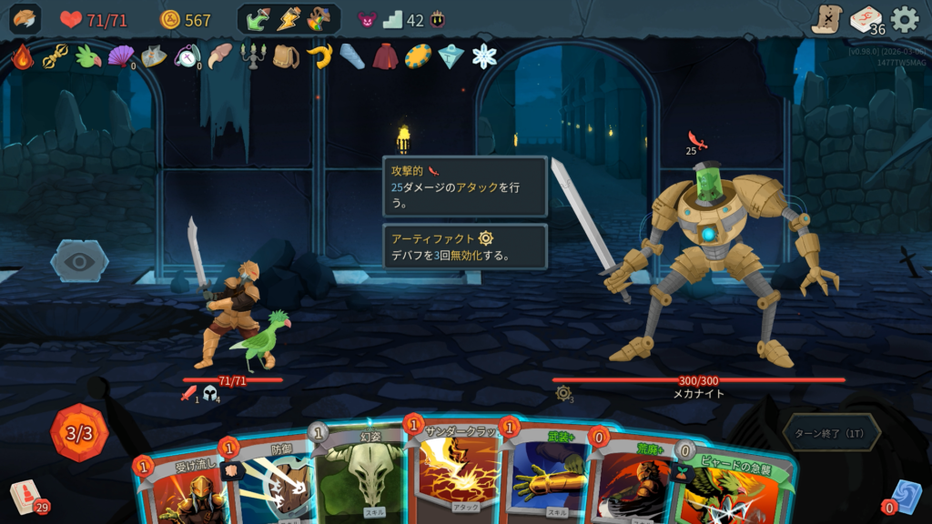 エリート2戦目はメカナイト。アーティファクト3持ちでデバフを3回無効化してくるのが厄介。