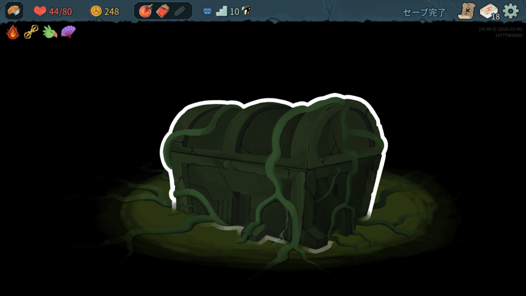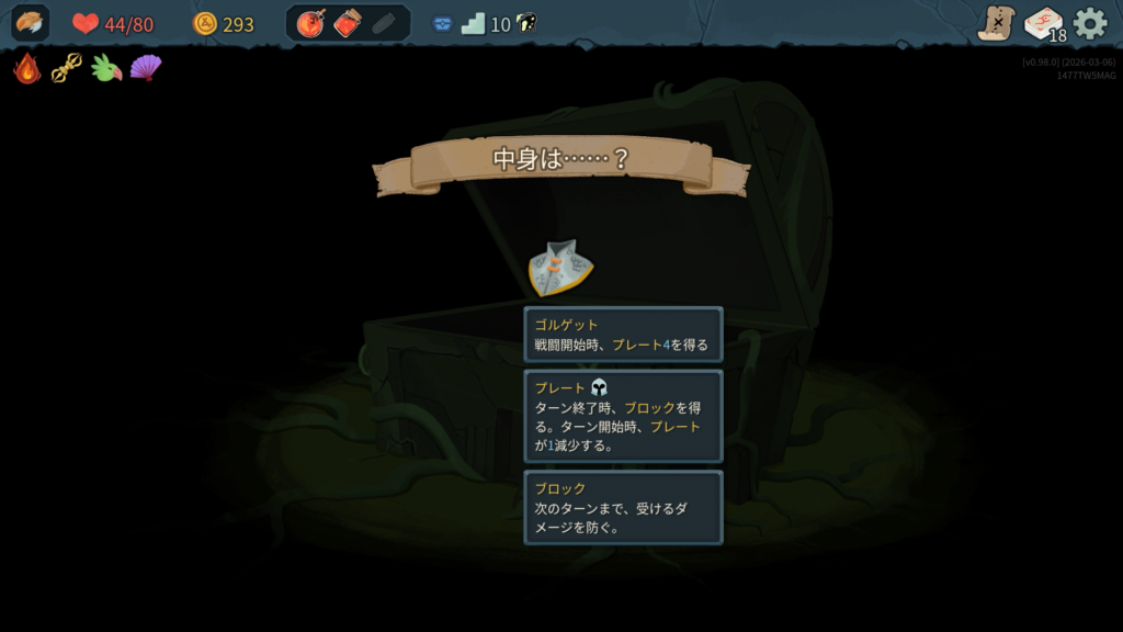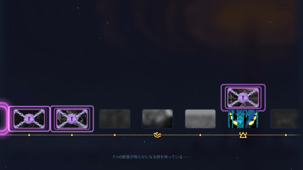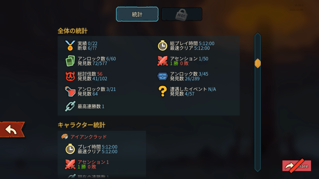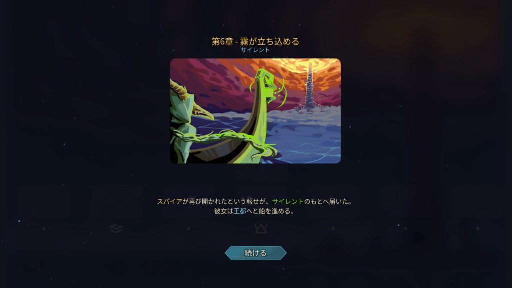 プレイ後、凝った作りの「年代記」にて出現カード、レリック、ポーションなどいくつかの要素がアンロックされました。イラストとともに少しのシナリオが解き明かされて要素がアンロックされるという流れでした。