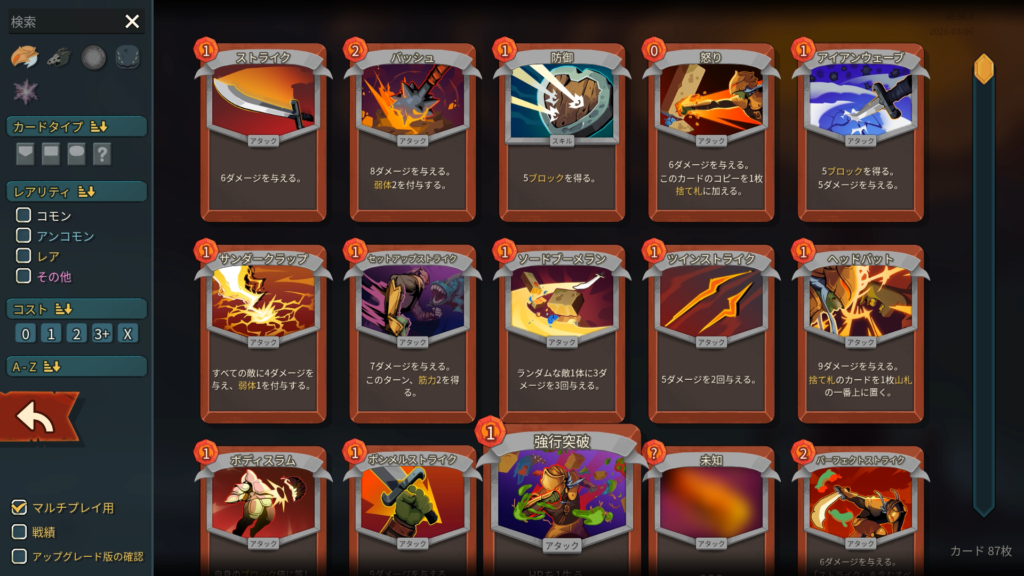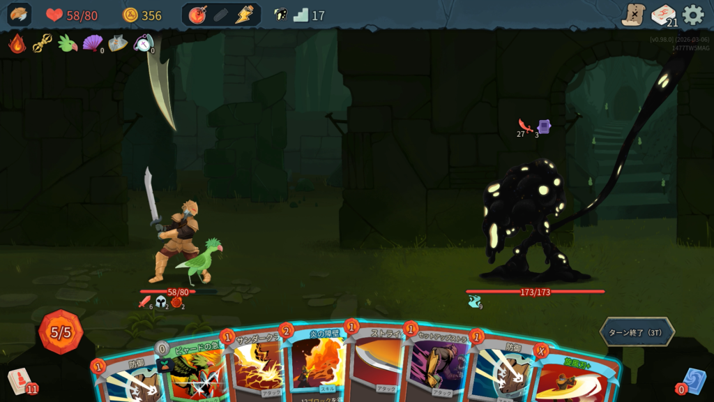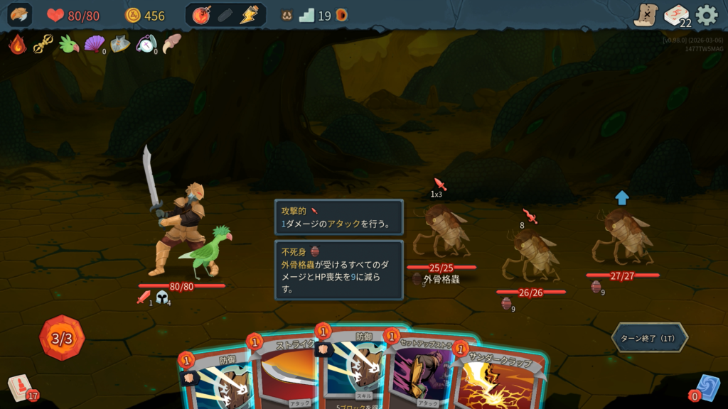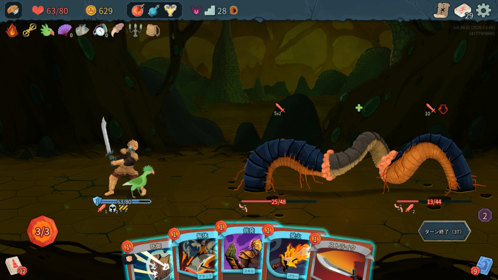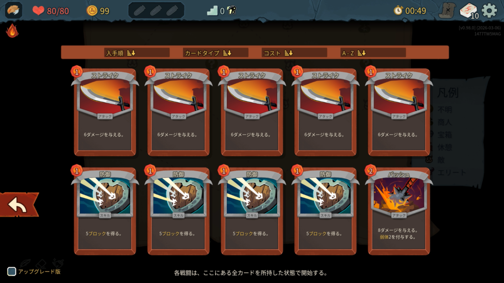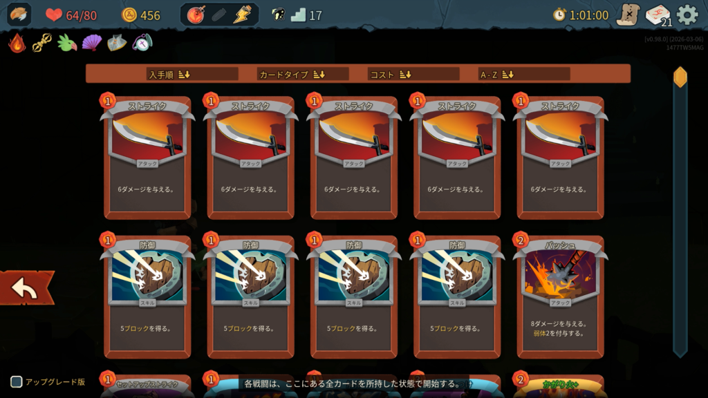 プレイ履歴はこんな感じ。じっくり考えながらやったので5時間かかりました。僕は前回もプレイは遅かったです。コース取りは、とにかくエリート討伐を優先してレリックを稼ぎました。カードはできるだけスキップせずに取得していきました。前作よりも状態異常を混ぜてくる敵が多く、少ないデッキだと不利になりやすい傾向に思えます。