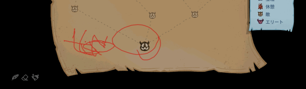 マップには落書きができるみたいです。左下の「ペン」、「消しゴム」、「全消し」が選択できます。マルチプレイでの意思疎通に使えそうですね。ペンの色はキャラの色に対応してそうですね。僕は絵が下手なのでかたつむりだけ書いときました!