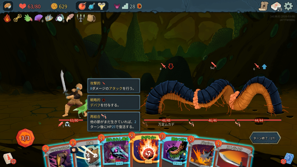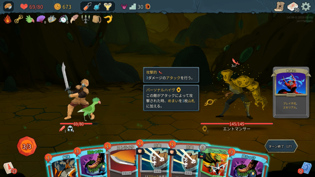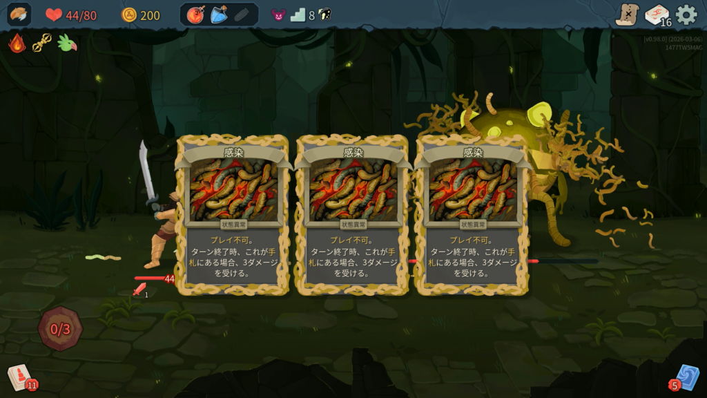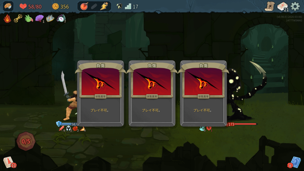 「火傷」(プレイ不可。ターン終了時、これが手札にある場合、2ダメージを受ける。)を4枚、直接手札に加えてくる行動をしてくるため、デッキが少ないとすぐに汚染されてしまいます。