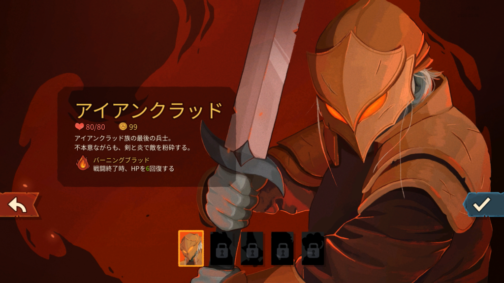 最初は5キャラいるうちのアイアンクラッドのみアンロックされているようです。それではアイアンクラッドを選択してゲームスタート。