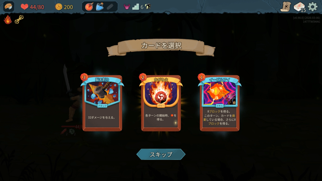 新カードの「かがり火」はアプグレで獲得エナジー2に。めちゃくちゃ強いですね。これを選びます。前作レア枠だった脳天割りがアンコモンに格落ちしてますね。能力は変わらないけど評価が見直されたみたいです。