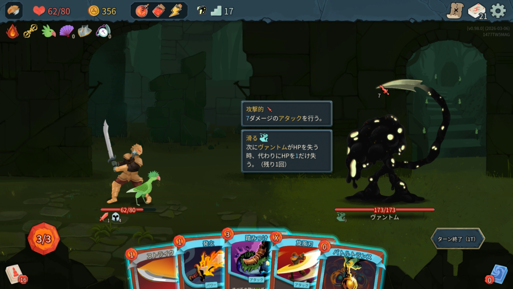 1層ボスはヴァントム。能力の「滑る」はHP損失を1に軽減。ヴァントムは滑る9持ちなのでHPを削るためにまずはこれを剥がす必要があります。1層ボスがヴァントムの場合、複数回攻撃できるアタックを優先的にピックするとよさそうですね。