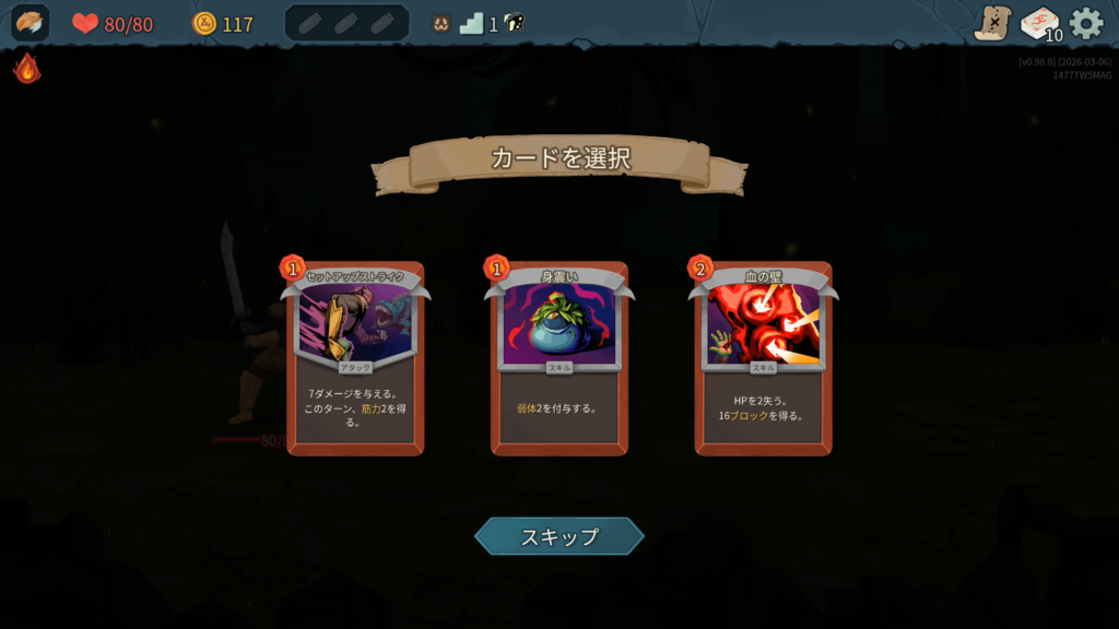 最初のカード報酬はすべて新カードでした。序盤は強いアタックを集めるのが前作の鉄則なのでそれに従い、左のセットアップストライクを取ります。デッキの火力を高めてエリートを狩りまくってレリックを集めたいと思います。