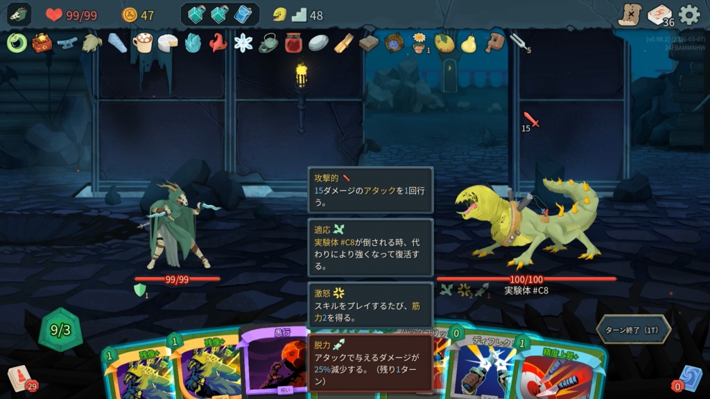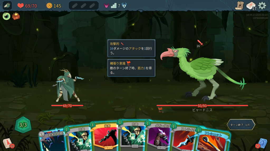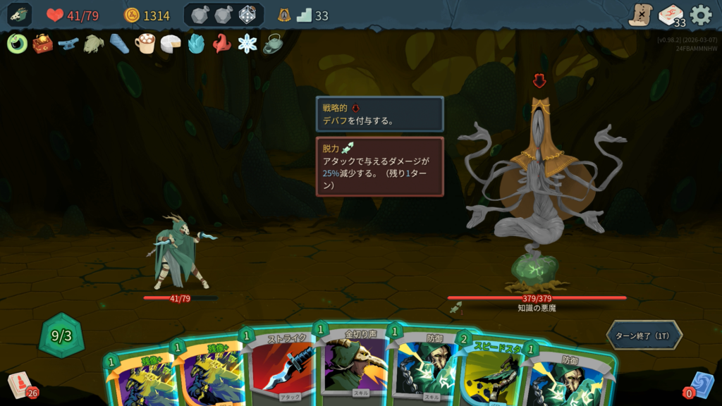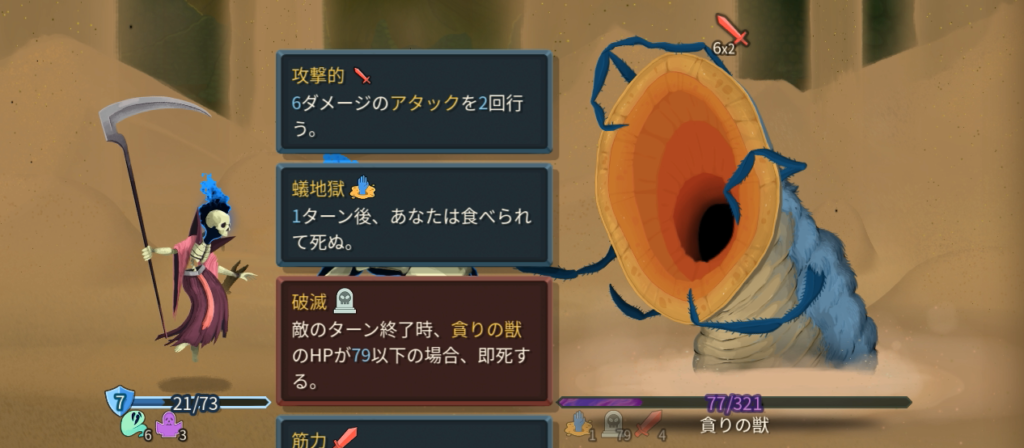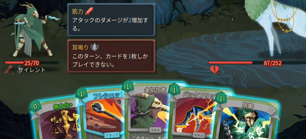 「すき込み」付与後の2T以降、毎ターン筋力+2しつつ攻撃してくる。HPを半分削ってからは、1ターンにカードを1枚しか使えなくなる「耳鳴り」が厄介なため、次の攻撃を1枚で耐えれる高コストの防御カードなどあると良い。