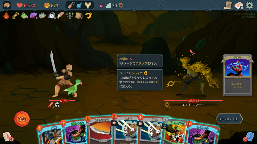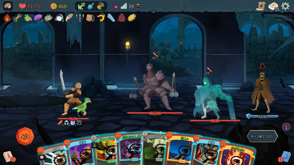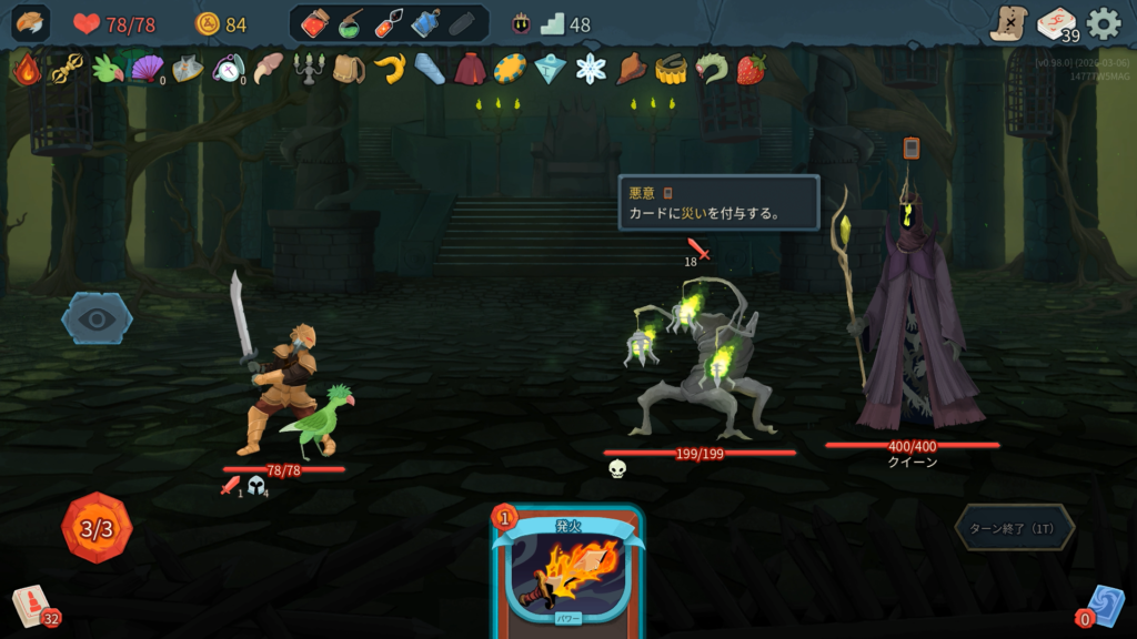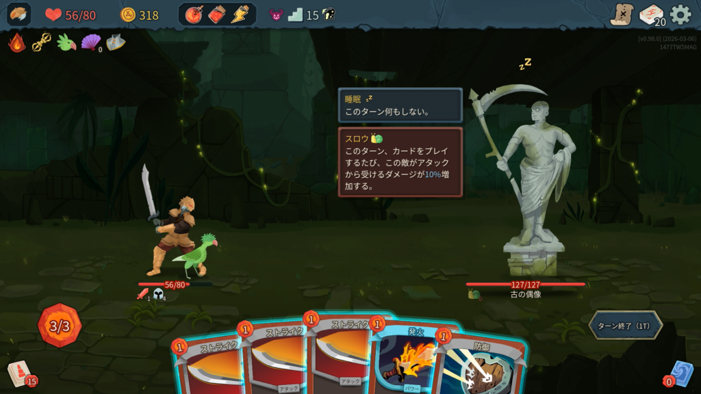 能力の「スロウ」により、1ターン中にカードを使う度古の偶像に与えるダメージが増える。3ターン目以降の火力が高いため早期決着を目指したい。