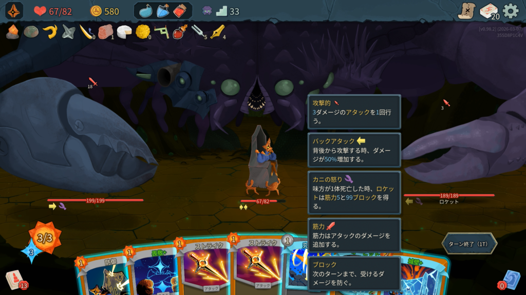 「カニの怒り」: 味方が1体死亡した時、クラッシャー(もしくはロケット)は筋力5と99ブロックを得る。