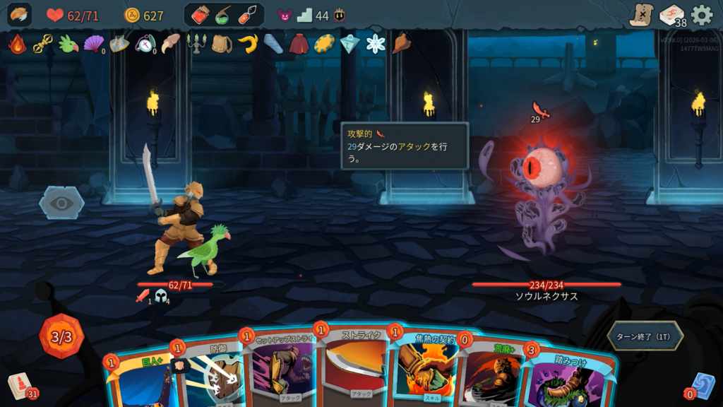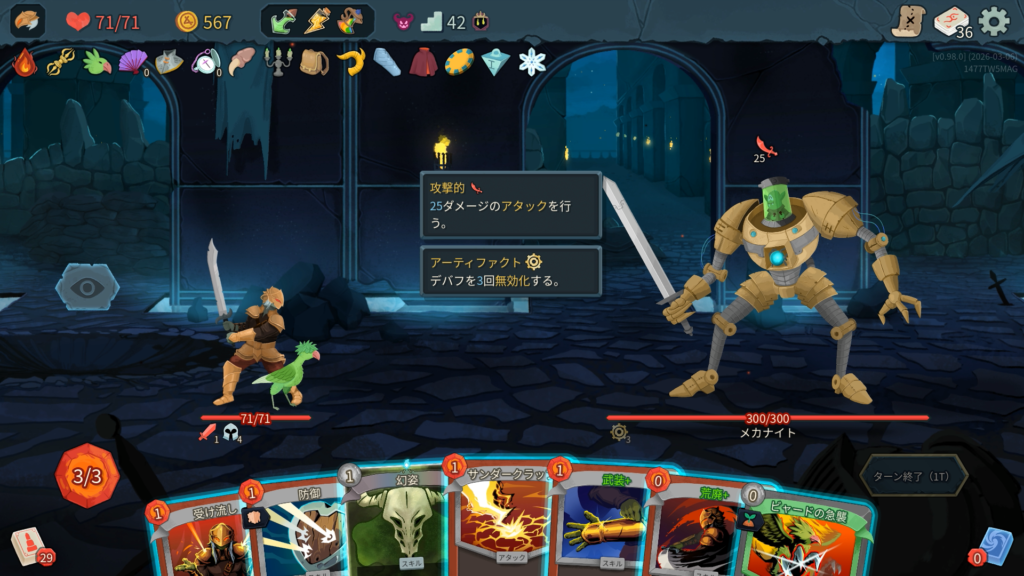 2T~4Tの行動を繰り返す。デバフを無効化する「アーティファクト」を3持った状態で開始。これがあるうちは脱力や筋力下げといったデバフが効かないため被ダメのリスクが高い。デッキが少ないと「火傷」が溜まりやすいため注意。