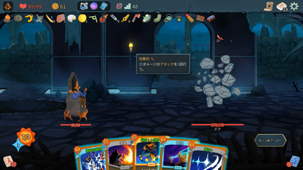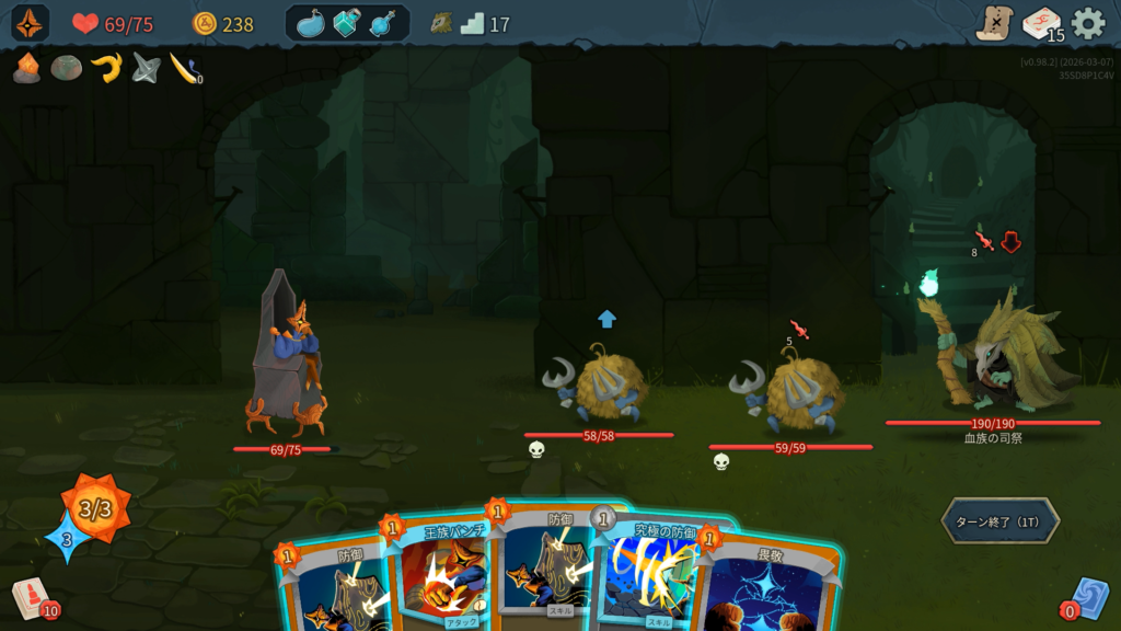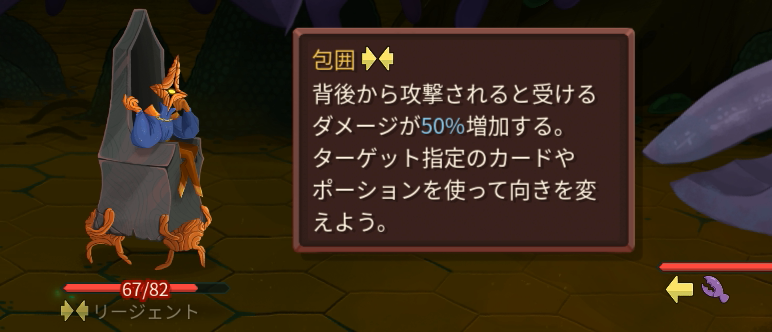 背後からの大ダメージには、ターゲット指定のカードやポーションを使って正面を向くことでダメージを軽減します。