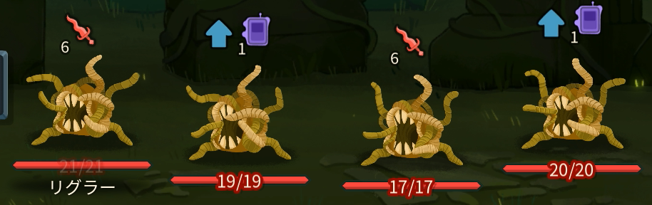 寄生カエルを倒すとリグラー4体が現れる。現れた直後はスタン状態。次ターンより、1T、2Tの行動を2体が逆順で繰り返す。早期決着に持ち込まないとデッキが汚染されてしまう。