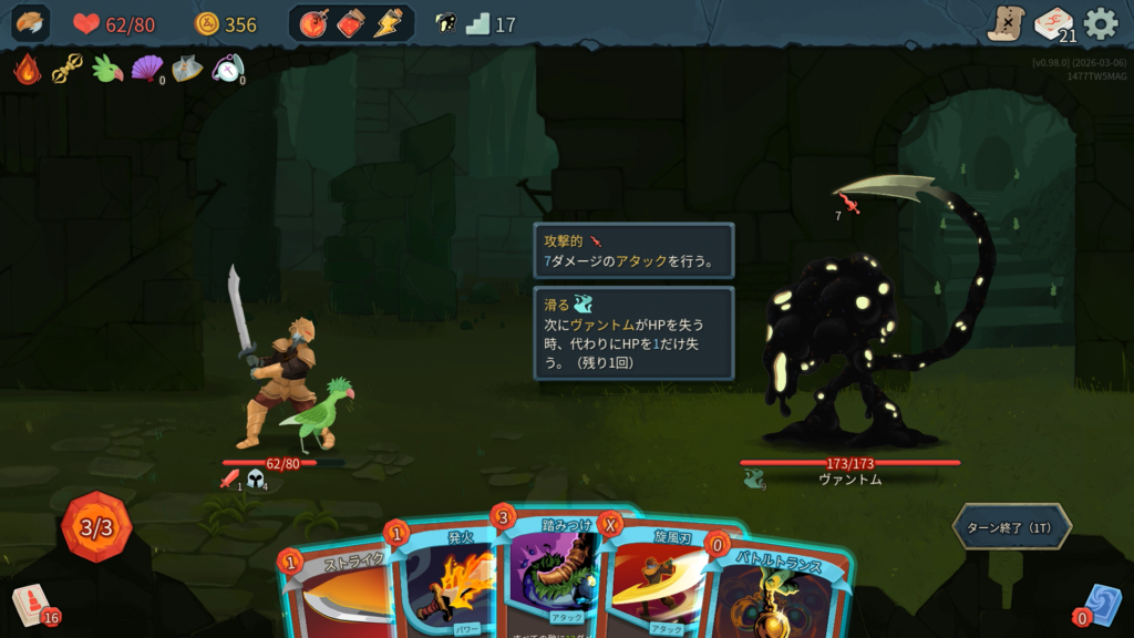 ヴァントムは「滑る」を9持った状態で戦闘開始するため、先に9回ダメージを入れる必要がある。多段攻撃などが有効。行動パターンは、1T~4Tの行動を繰り返す。4ターン毎に筋力が2乗るためダメージが嵩む。負傷によるデッキ汚染にも注意。
