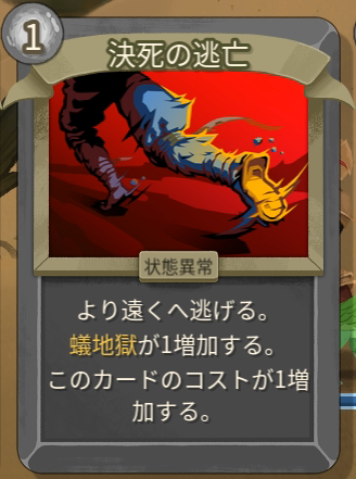 1T: 「蟻地獄」4を付与、「決死の逃亡」を山札に3枚、捨て札に3枚混ぜる