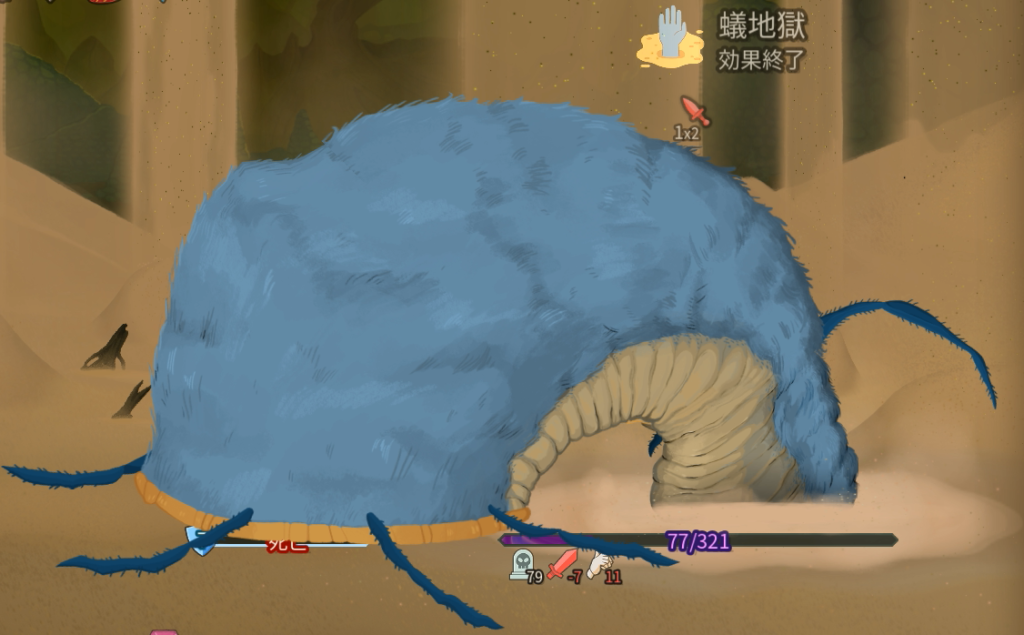 弱体中は被ダメが50%増えるためカッコの数値を参照。2T以降ランダム。同じ行動は繰り返さない。デバフを与えながら高火力でひたすら殴ってくる単純な敵。