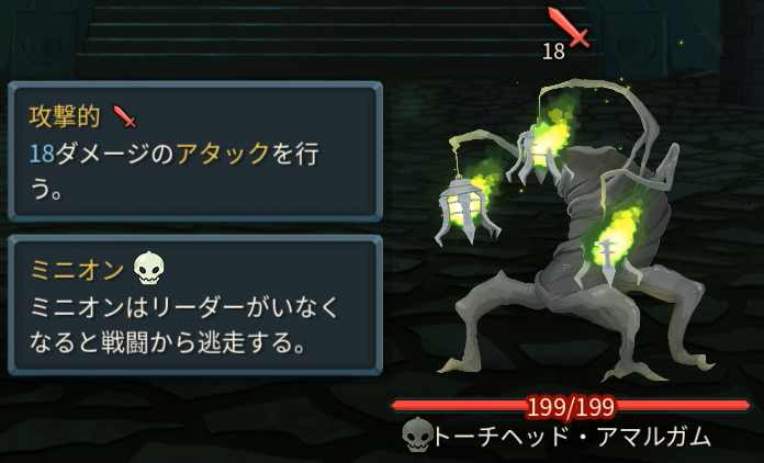 トーチヘッドが生きている間、3Tの行動を繰り返す。トーチヘッドを倒したターンのバフは自身への筋力+2に置き換わり、ブロックはつかない。